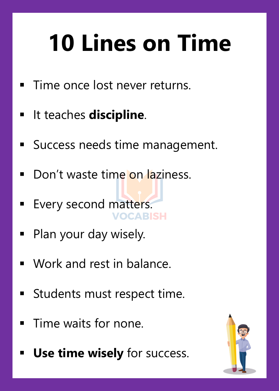 - Use time wisely for success.