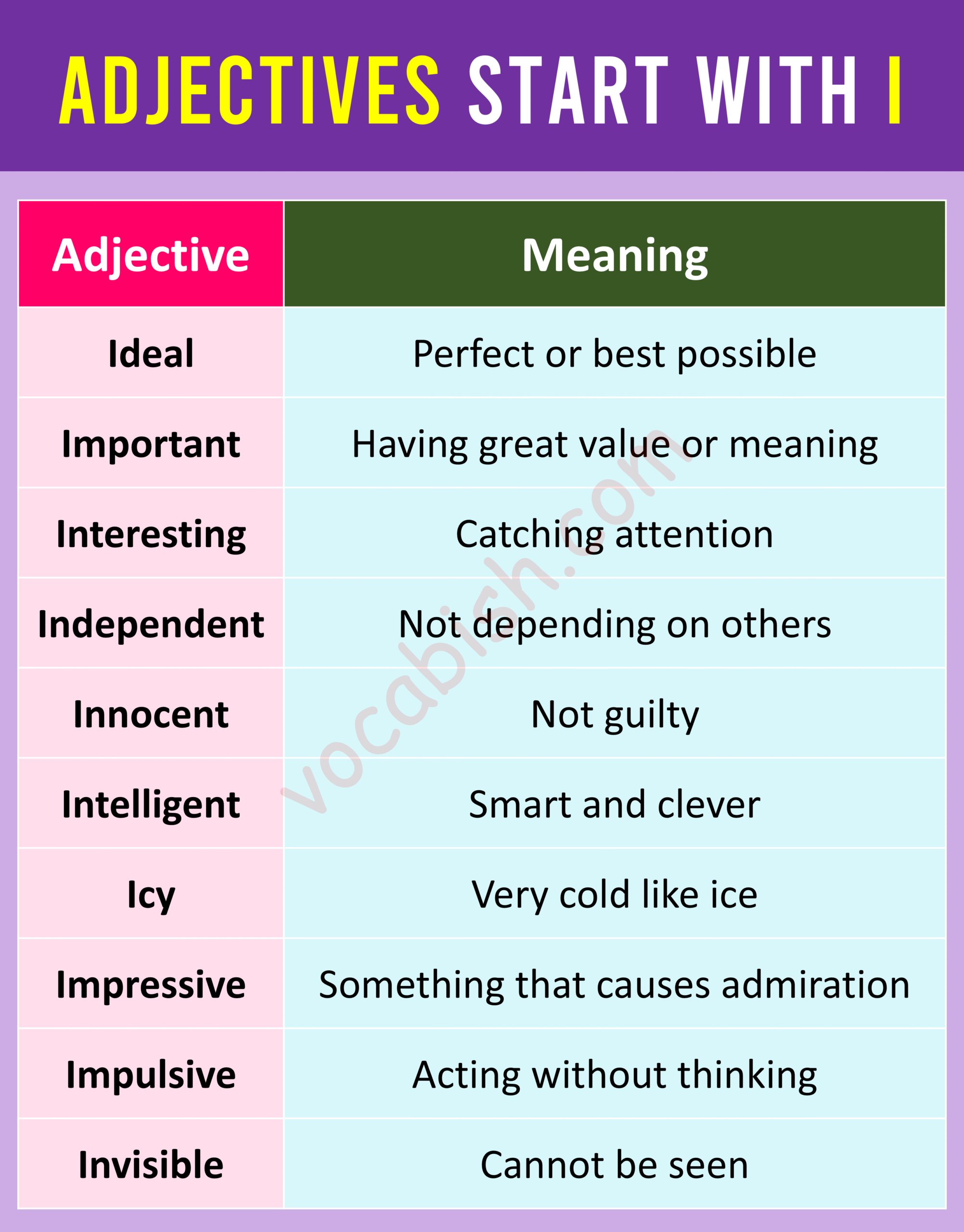 Adjectives that start with “I” make your English sentences more descriptive and clear. You can use them to express personality, feelings, or qualities in daily communication. Keep practising and try to use these adjectives in your conversations and writing.