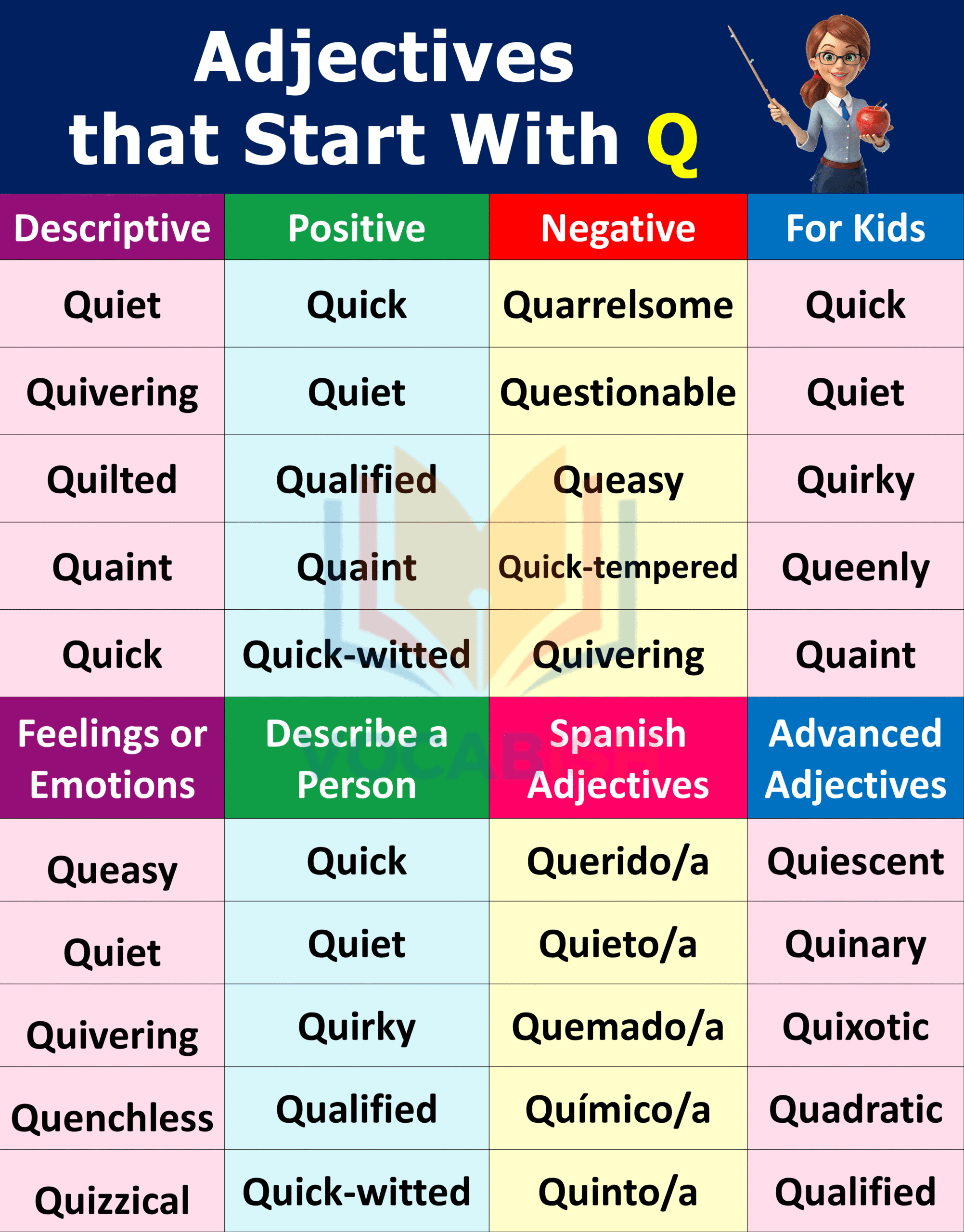 Below is a complete list of Q adjectives — some are everyday words, and others are advanced vocabulary for learners who want to go deeper.