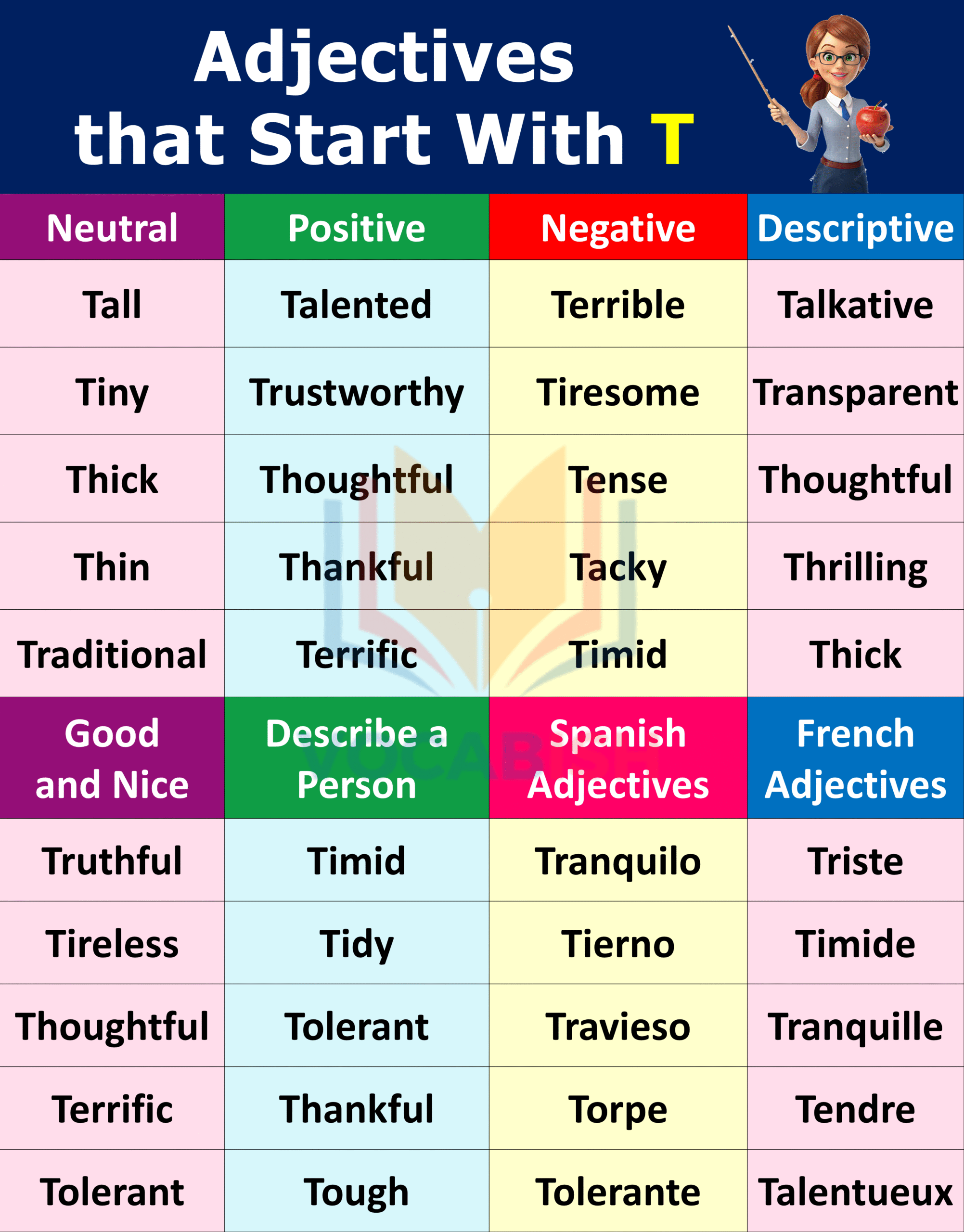 Adjectives beginning with T can describe people, things, or emotions in different situations. Some show positive meanings, while others express negative qualities.
