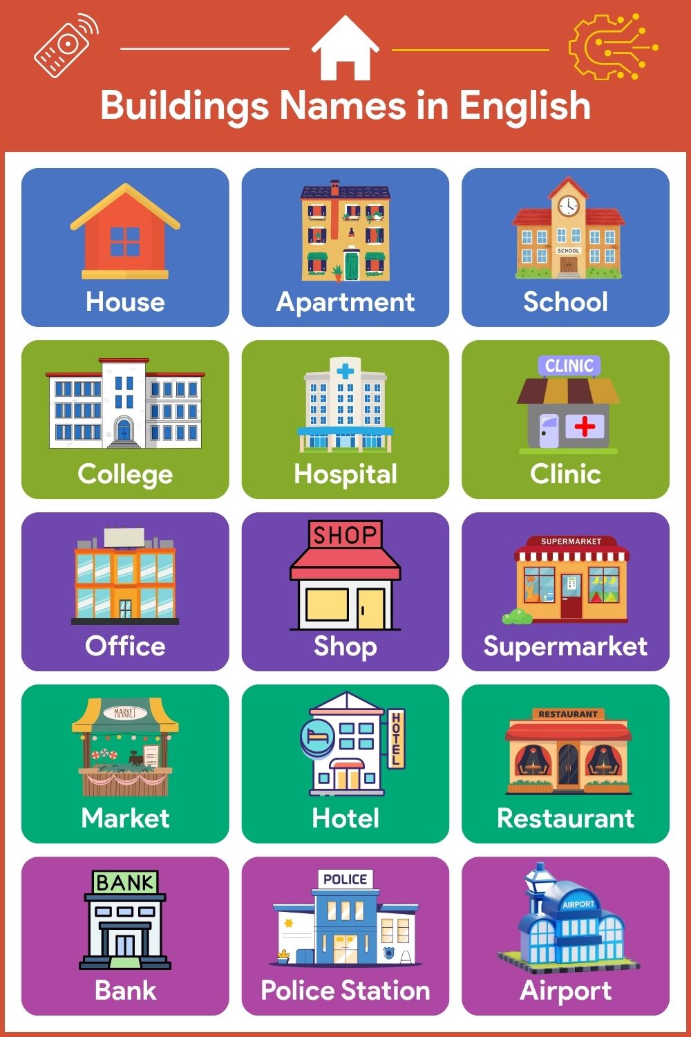 In this blog post, you will learn all types of buildings names in English and understand their different categories and uses. It helps English learners improve their vocabulary and remember building names easily. You will be able to recognise and use these words confidently in daily life, at school, or while travelling.