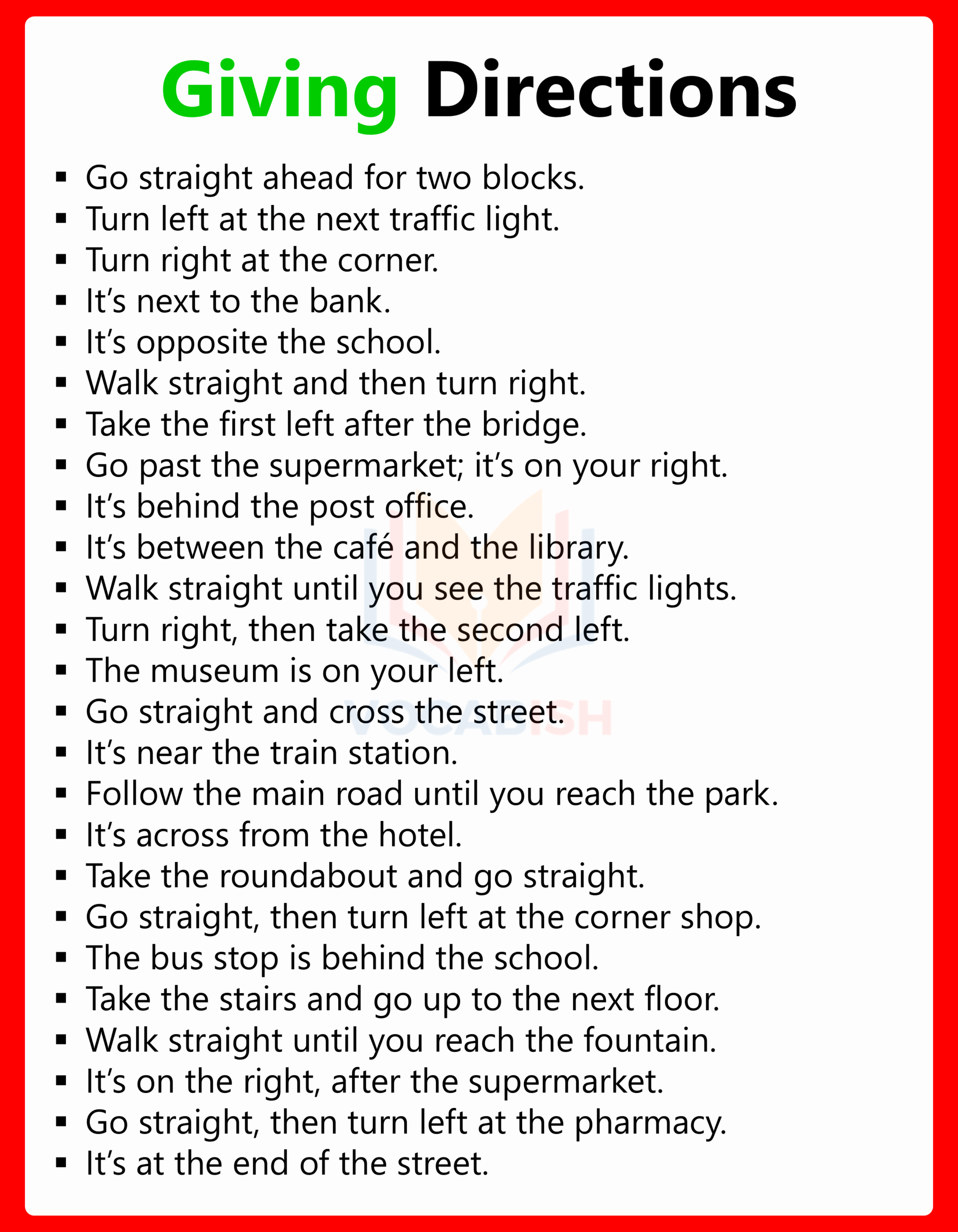 The above-given examples are a complete set of 180+ practical examples for asking, giving, warning, and offering solutions for directions.