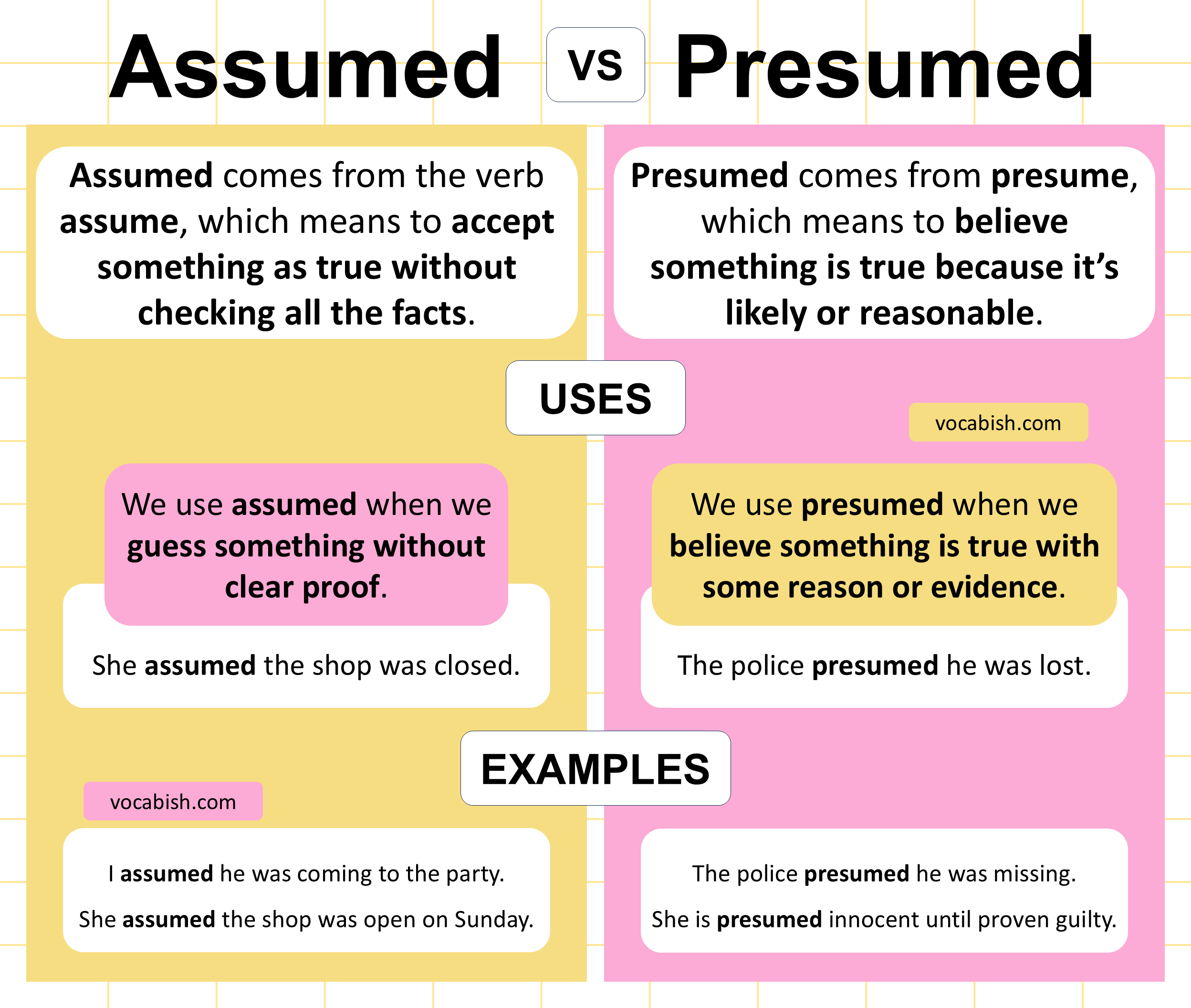 Both assumed and presumed mean believing something without full proof, but they are not the same. Use assumed for guesses and presumed for logical beliefs or reasonable conclusions.