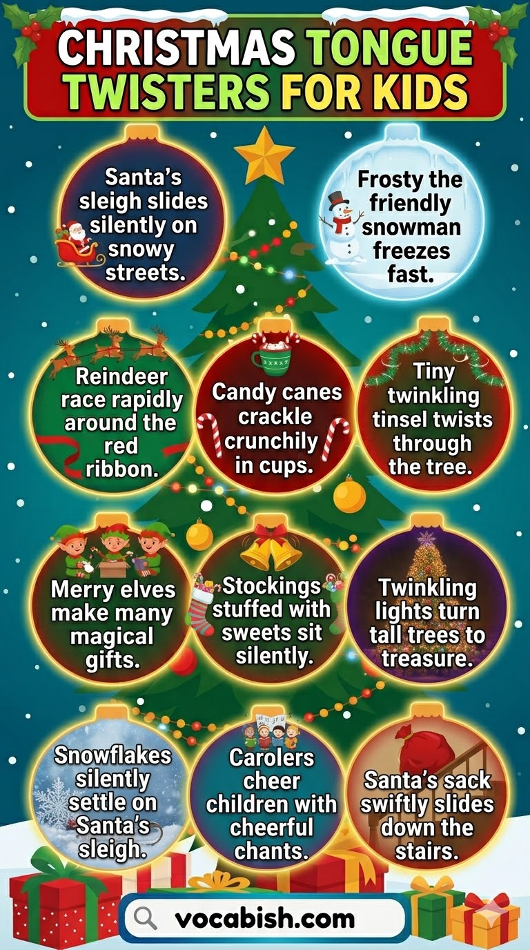 Christmas tongue twisters for kids are fun, short phrases with repeated sounds. They help children practice pronunciation, learn festive vocabulary, and improve English speaking skills.