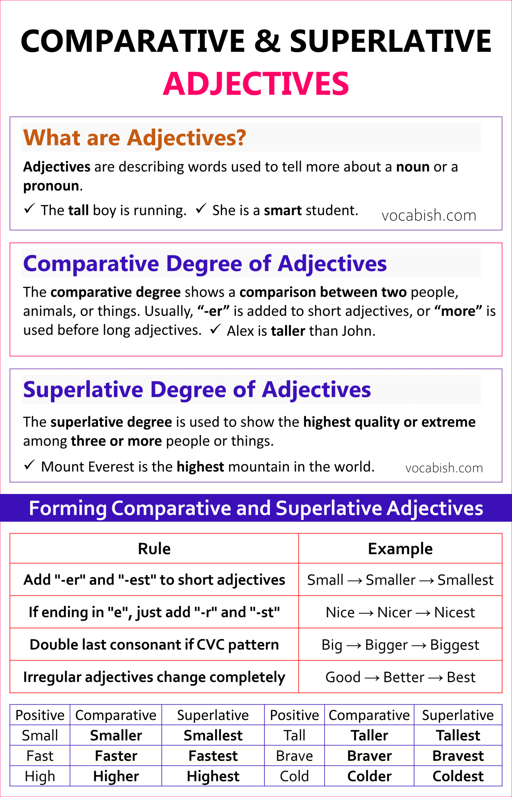 In this article, you will learn what adjectives are, how to form comparative and superlative degrees, and when to use them — with easy examples and useful rules.