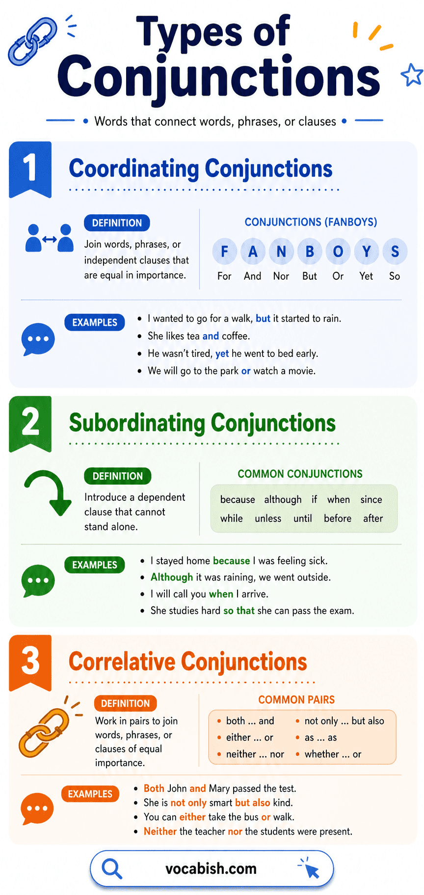 Conjunctions help you connect ideas clearly and naturally. Once you understand the three main types—coordinating, subordinating, and correlative—you can build stronger, more fluent sentences.