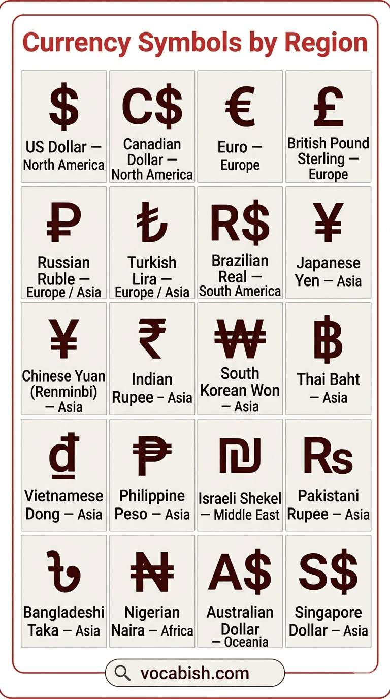 Grouping currencies by world region helps English learners understand where different money symbols are commonly used. It also makes it easier to remember currencies based on geography.