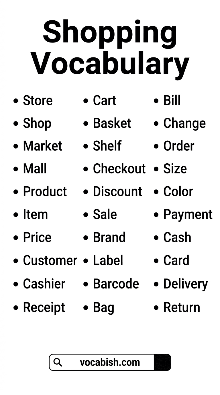 Shopping is part of everyday life. People visit stores, markets, and online shops to buy food, clothes, and many other things. To communicate well in these places, learners need shopping vocabulary. These are the words people use when they talk about products, prices, payment, and store services. When learners learn these words, they can ask questions, understand store signs, and talk with shop staff more easily. Strong daily vocabulary also supports speaking, reading, writing, and listening skills in real situations.