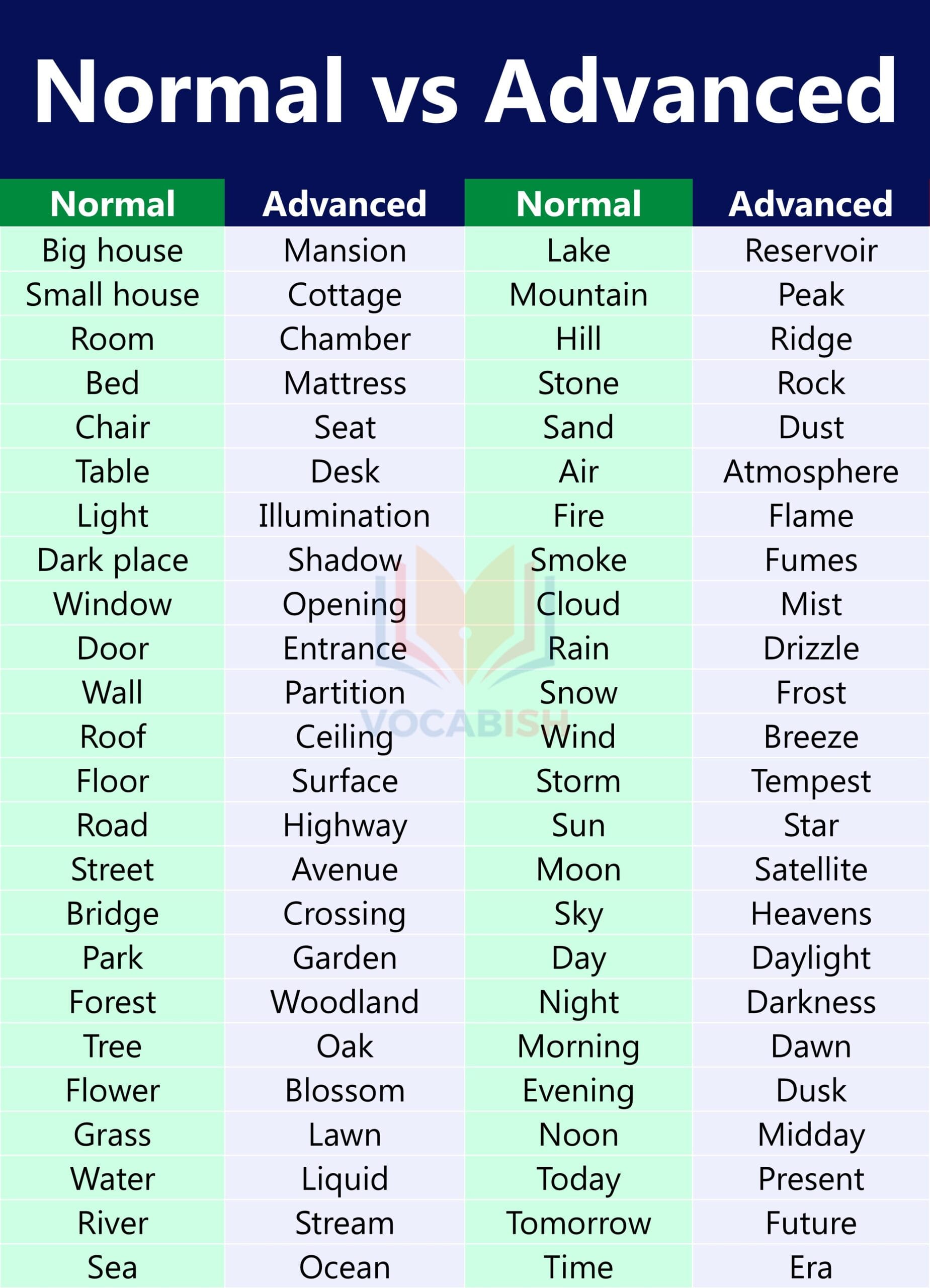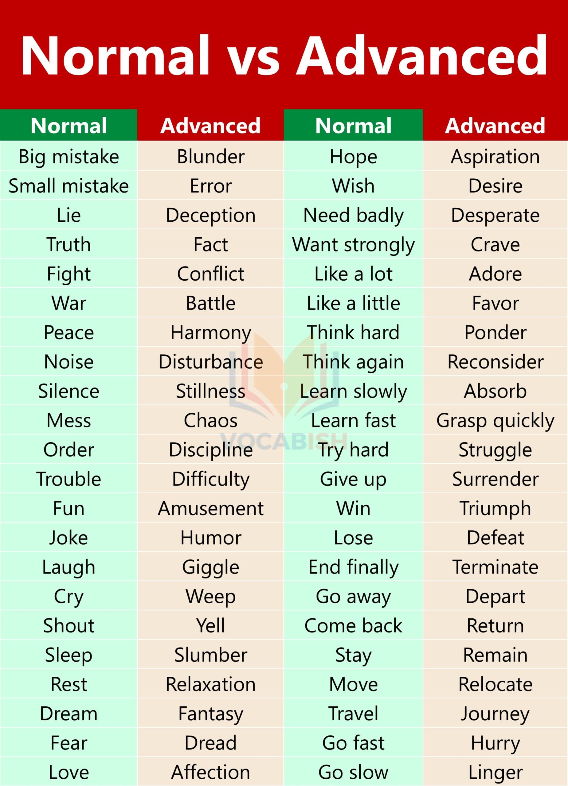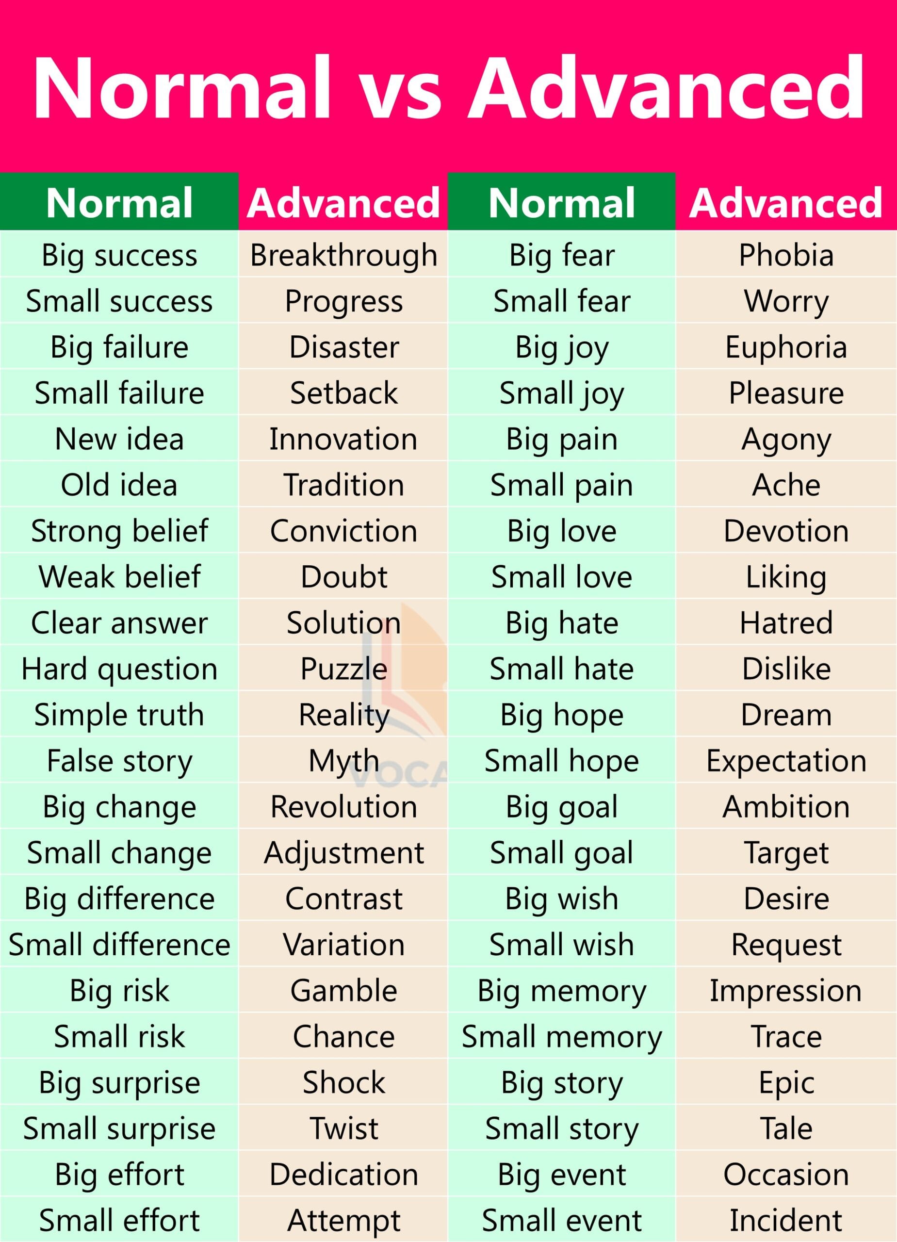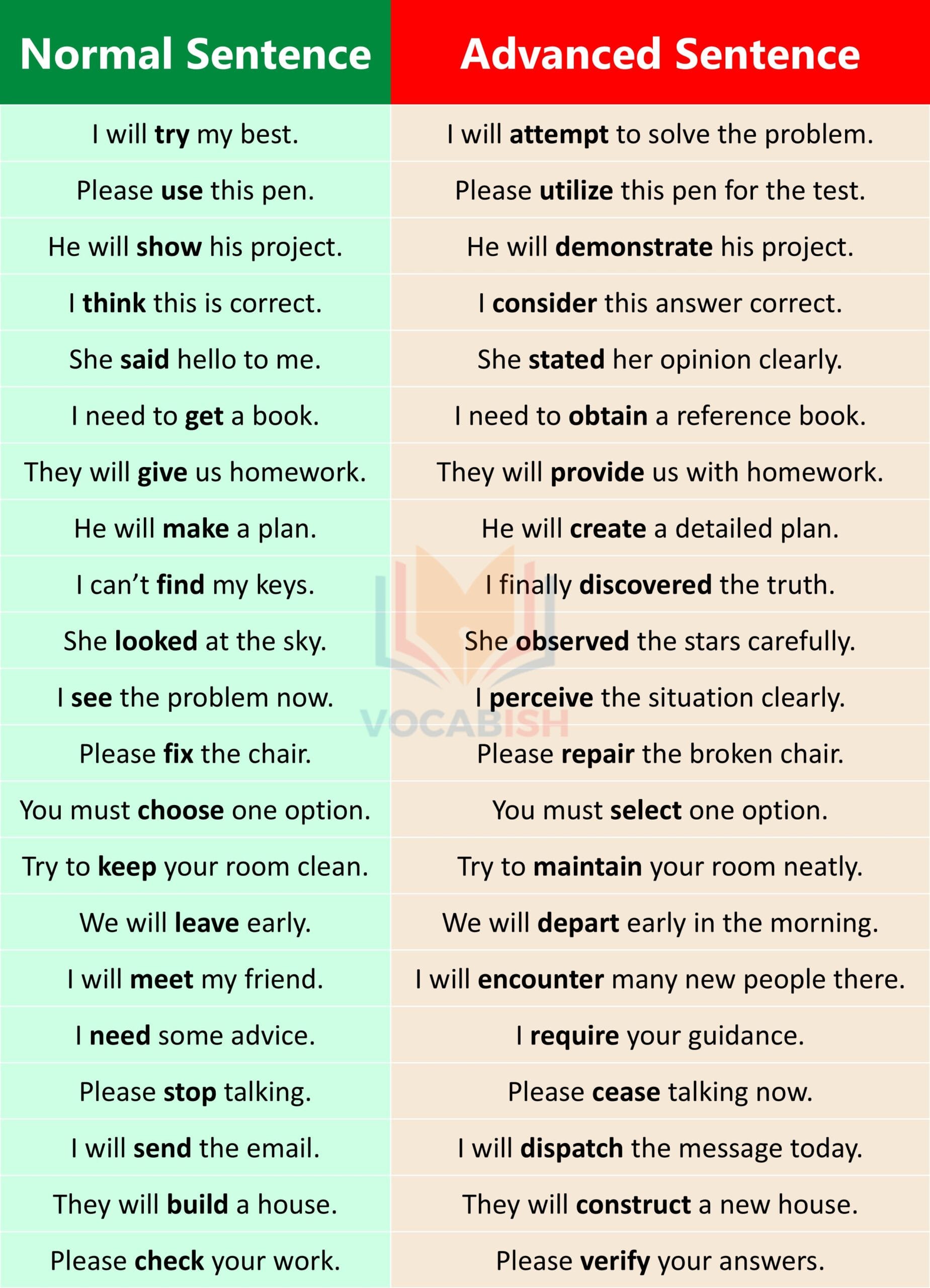 Here’s the table that shows that how to use these normal and advanced English words in sentences: