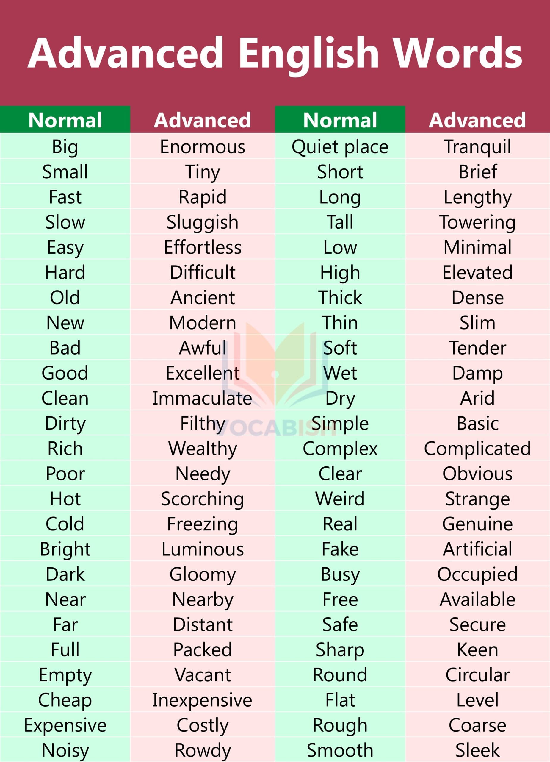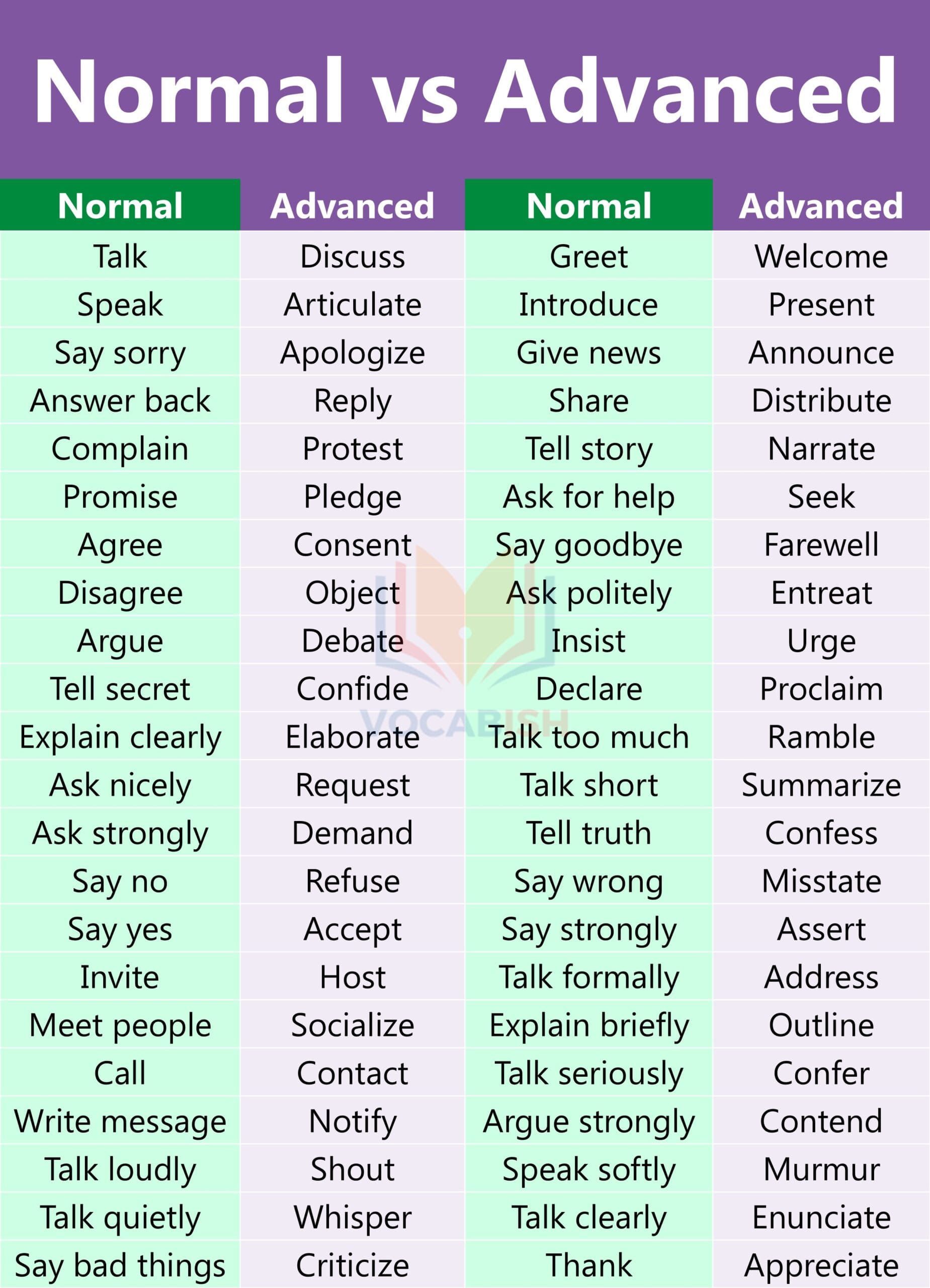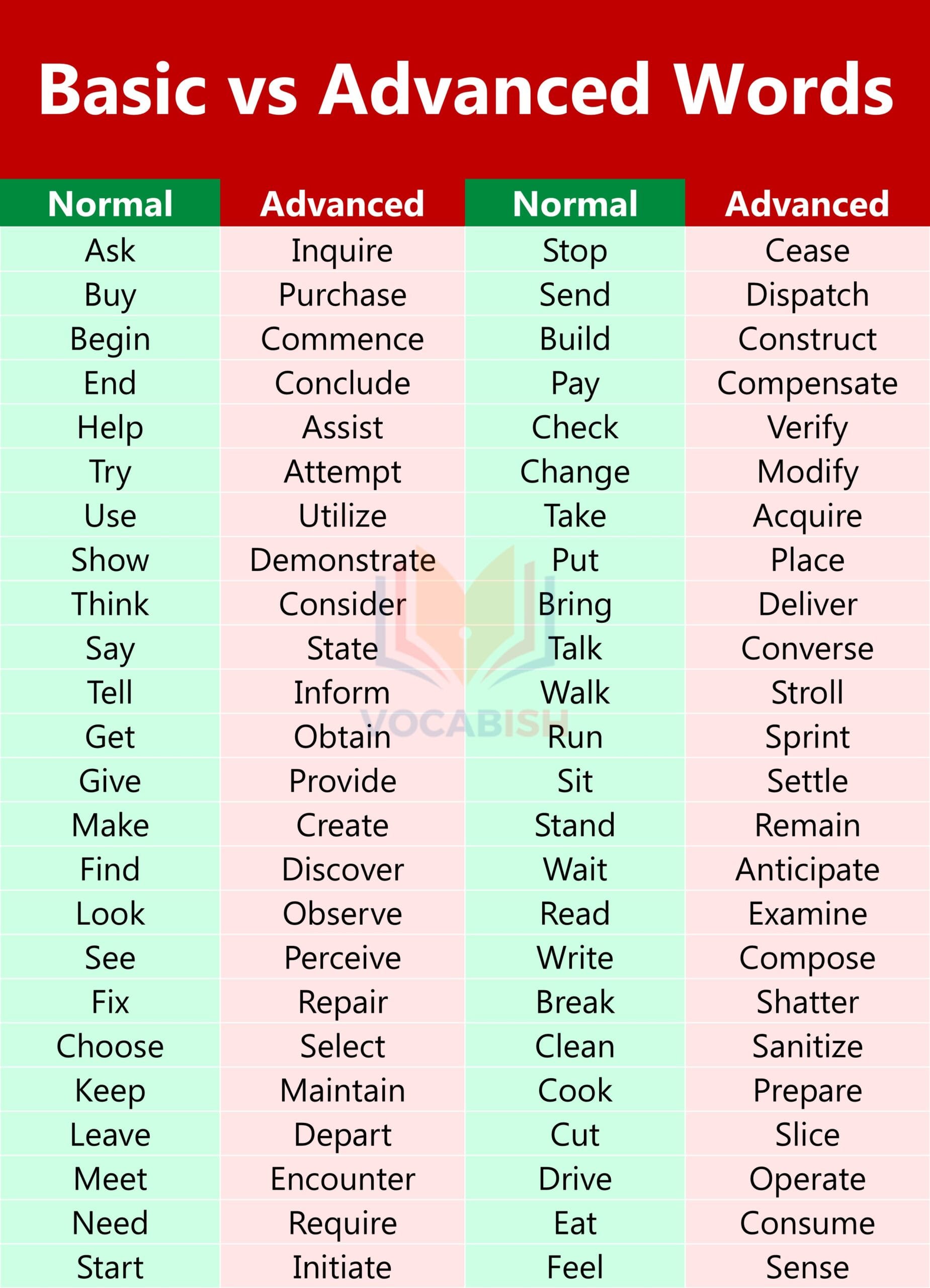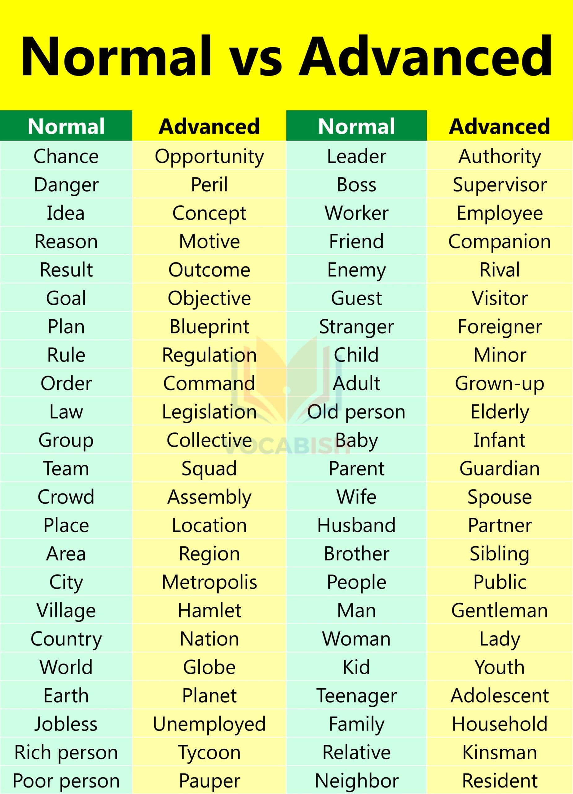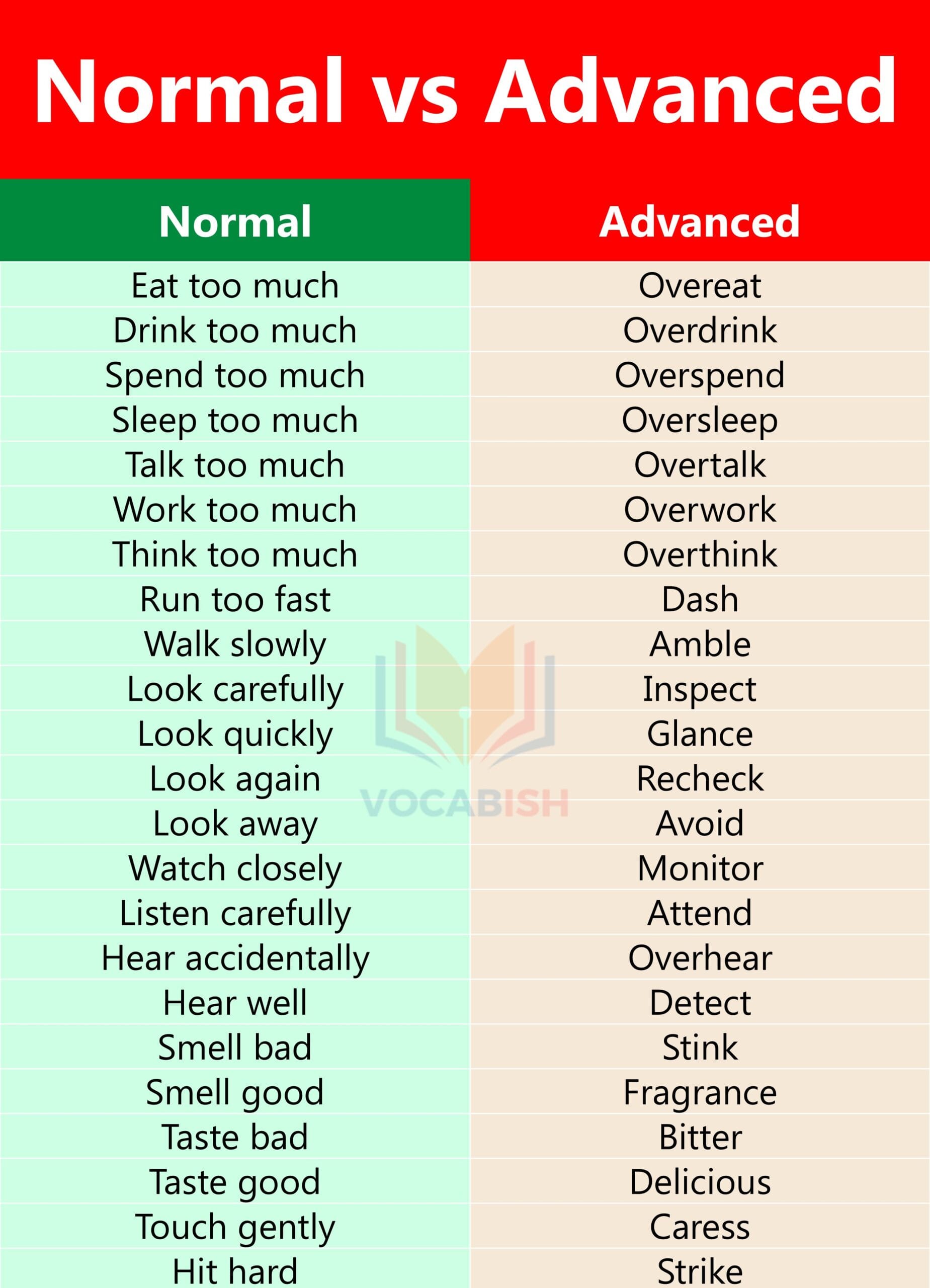 Here’s the table that shows that how to use these normal and advanced English words in sentences: