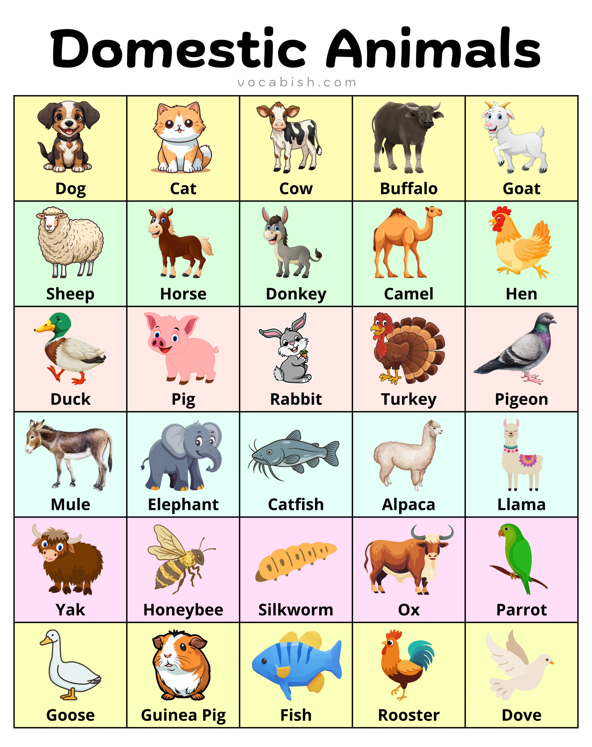 Domestic animals play a big role in human life. They help us in work, give us food, and become our friends. Knowing their names and uses helps you improve your English vocabulary and understand the world around you better.