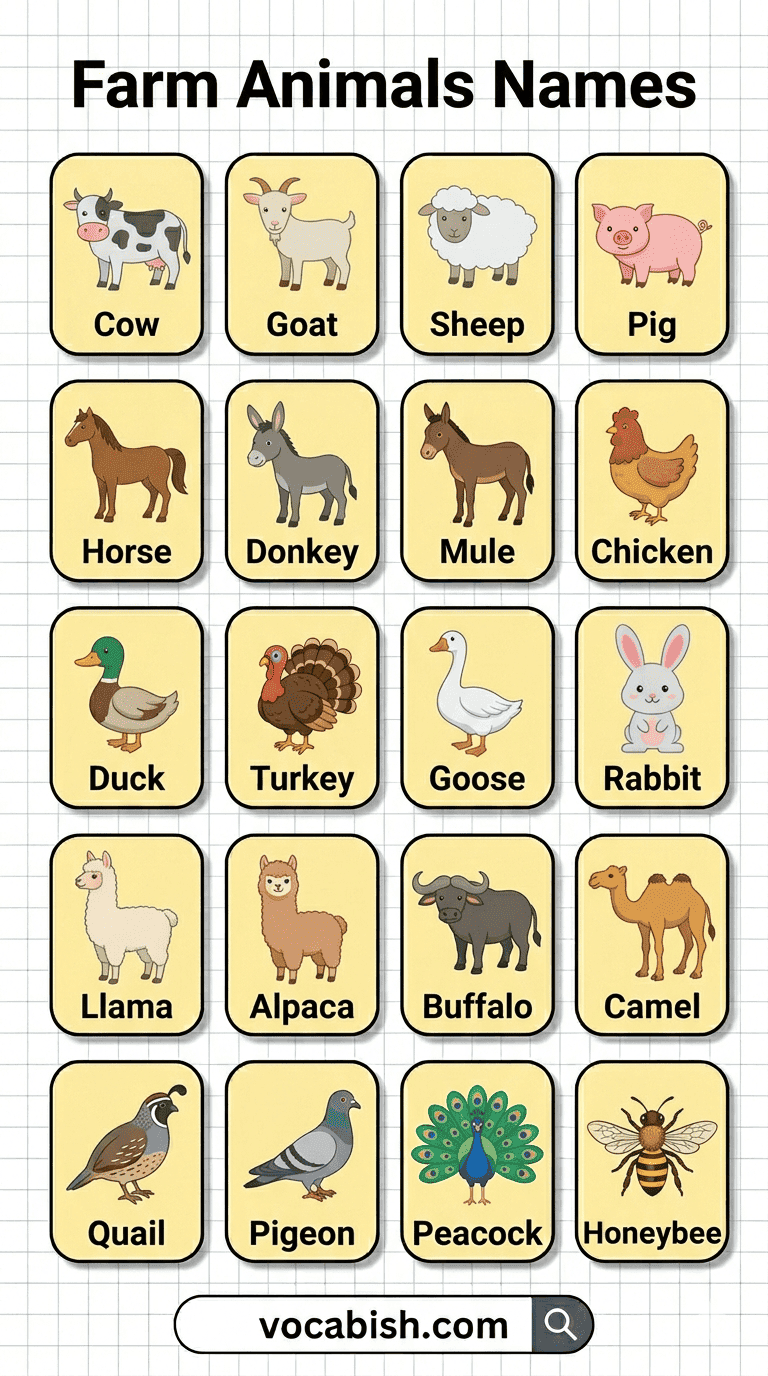 Common farm animals names include cow, goat, sheep, horse, pig, chicken, duck, turkey, and rabbit. These are basic words for English learners.