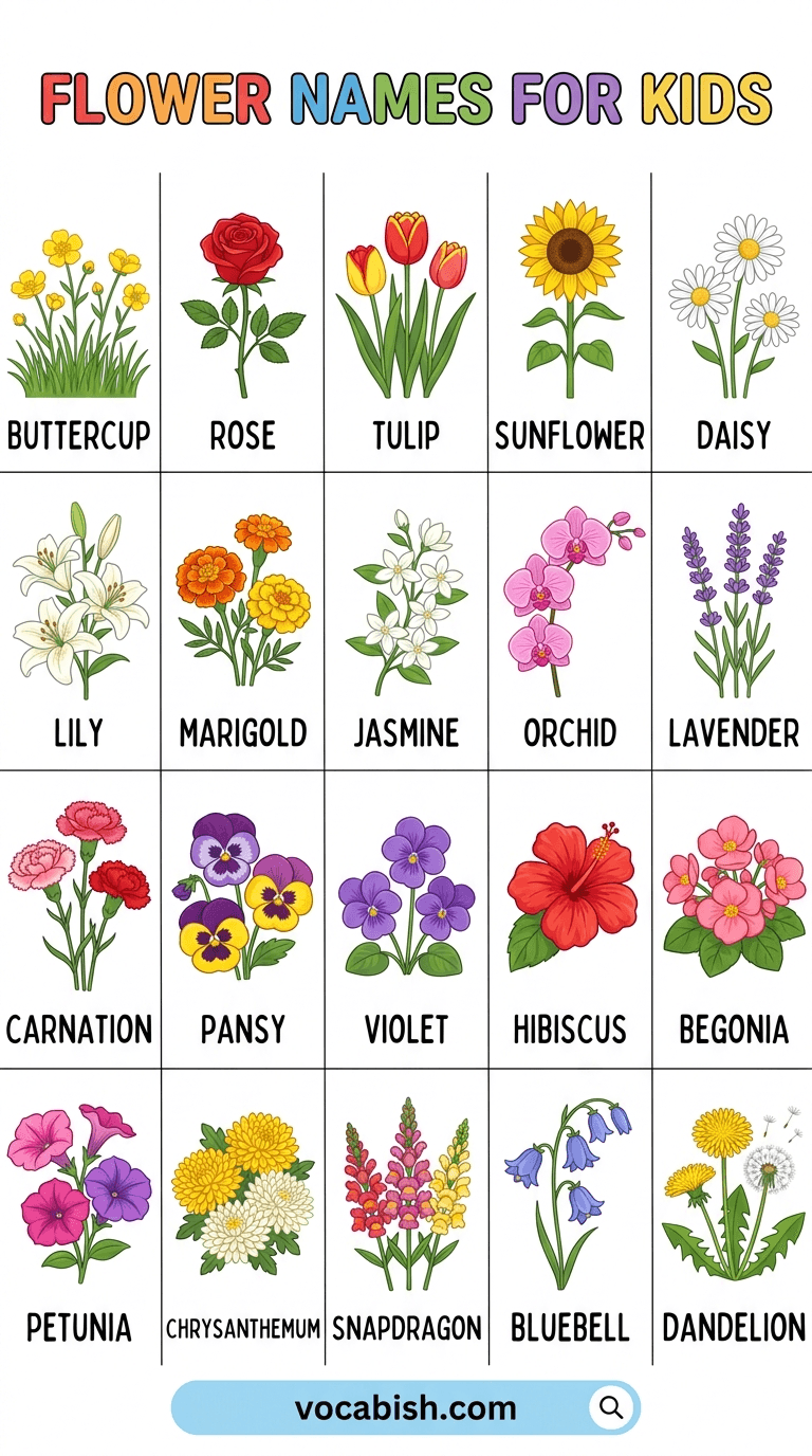 Posted on April 4, 2026April 4, 2026 By Muhammad Matloob No Comments on 50 Flowers Name for Kids in English with Pictures