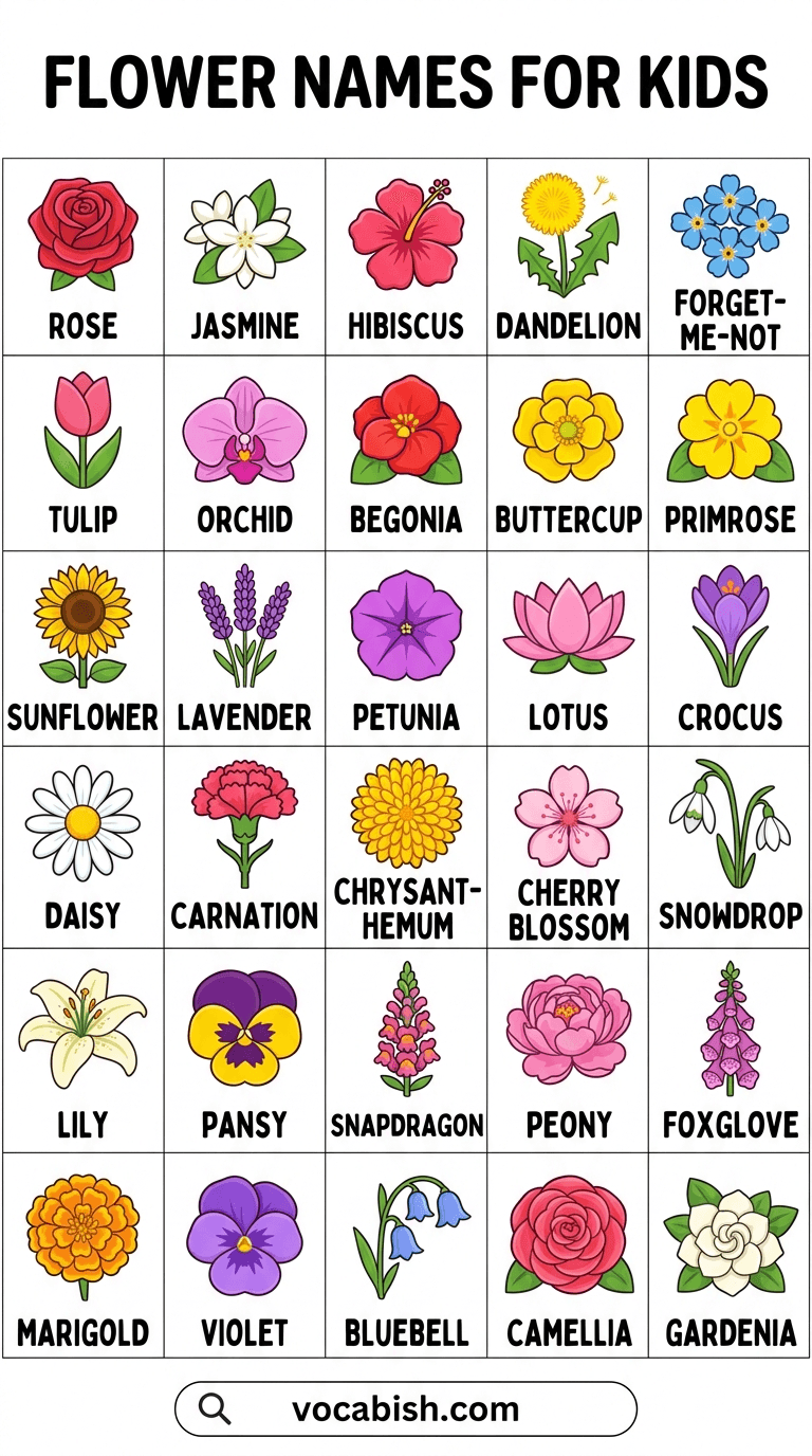 Learning flower names in English is simple when you see them in gardens, parks, or books. Try to say the name aloud and use it in sentences: