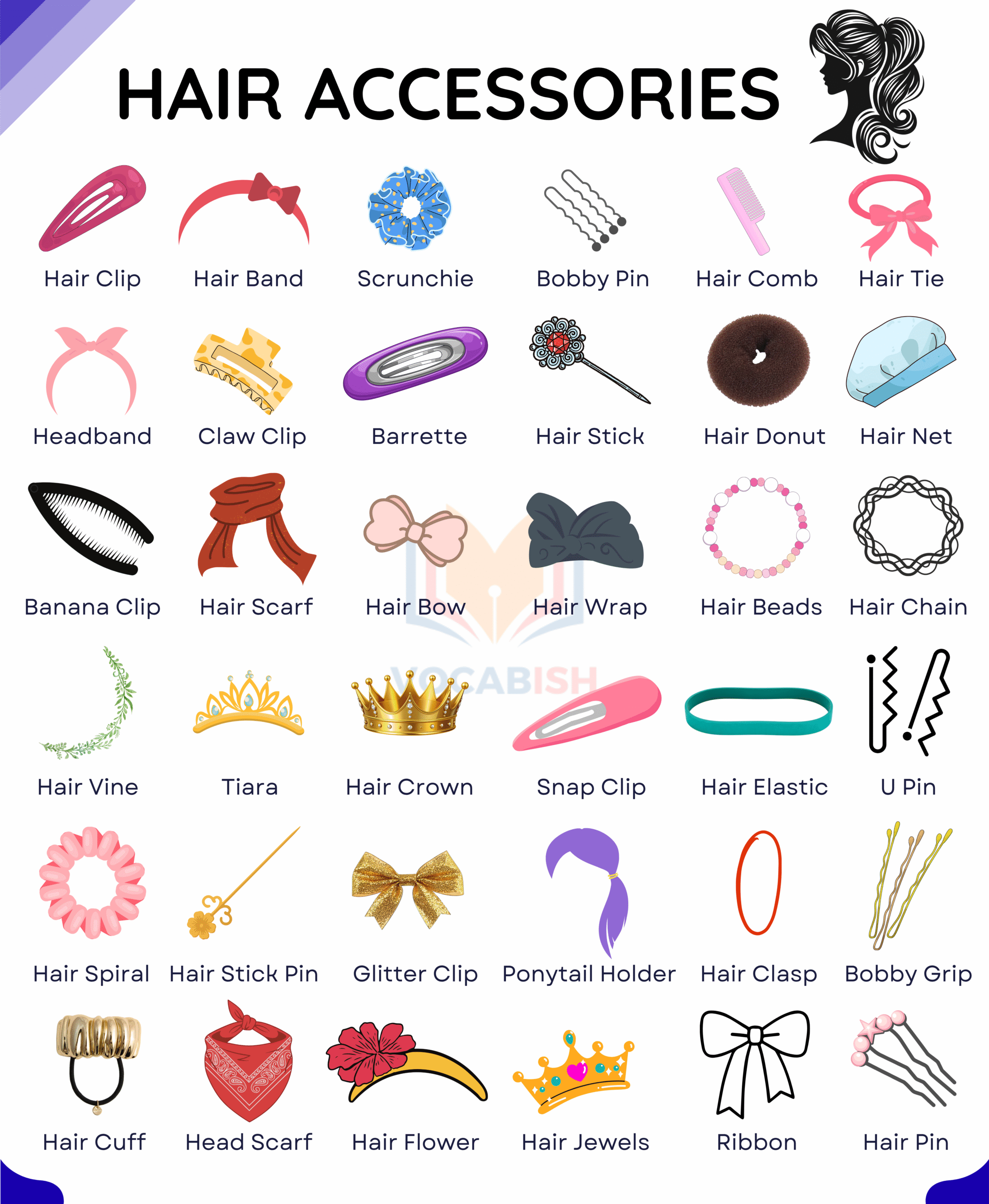 Examples: Hairbands, Scrunchies, Barrettes, Hair Chains, and Tiara.