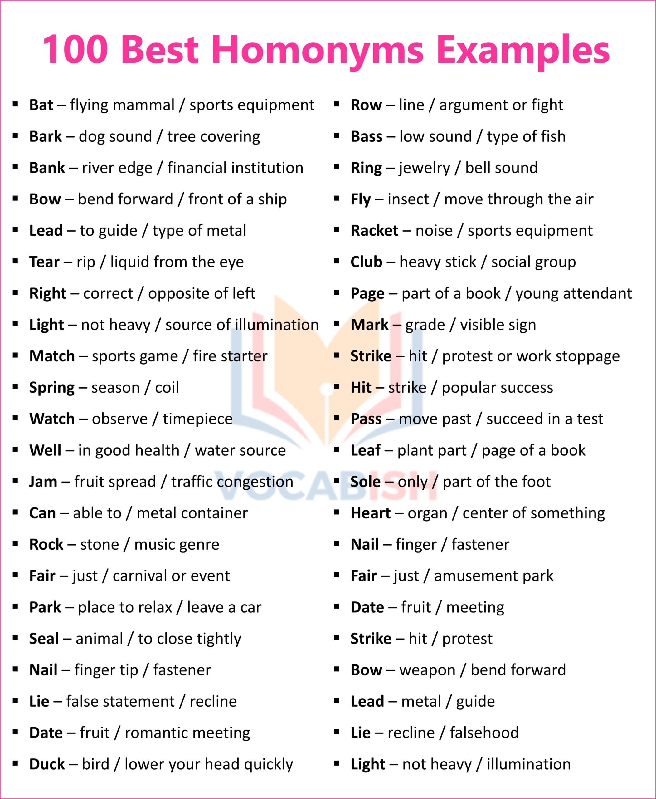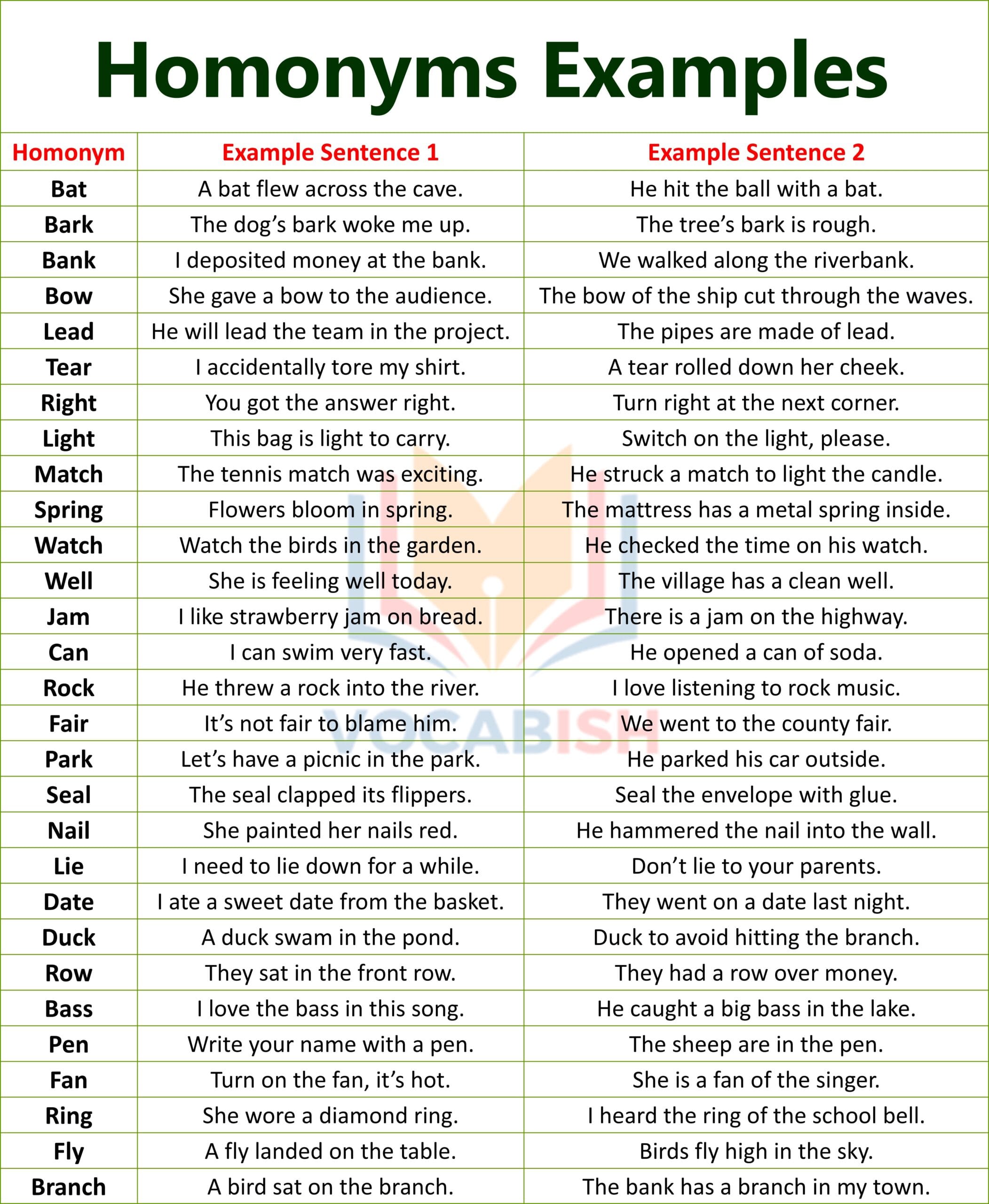 In this blog post, you will learn homonyms, their meanings, and example sentences in English. Homonyms are words that are spelled or pronounced the same but have different meanings. Learning these words is important for English learners because they help improve your speaking, reading, writing, and listening skills. When you know homonyms, you can speak more accurately, understand texts with better clarity, write sentences correctly, and follow conversations easily. Keep reading to build your vocabulary and master 100 common homonyms in English.