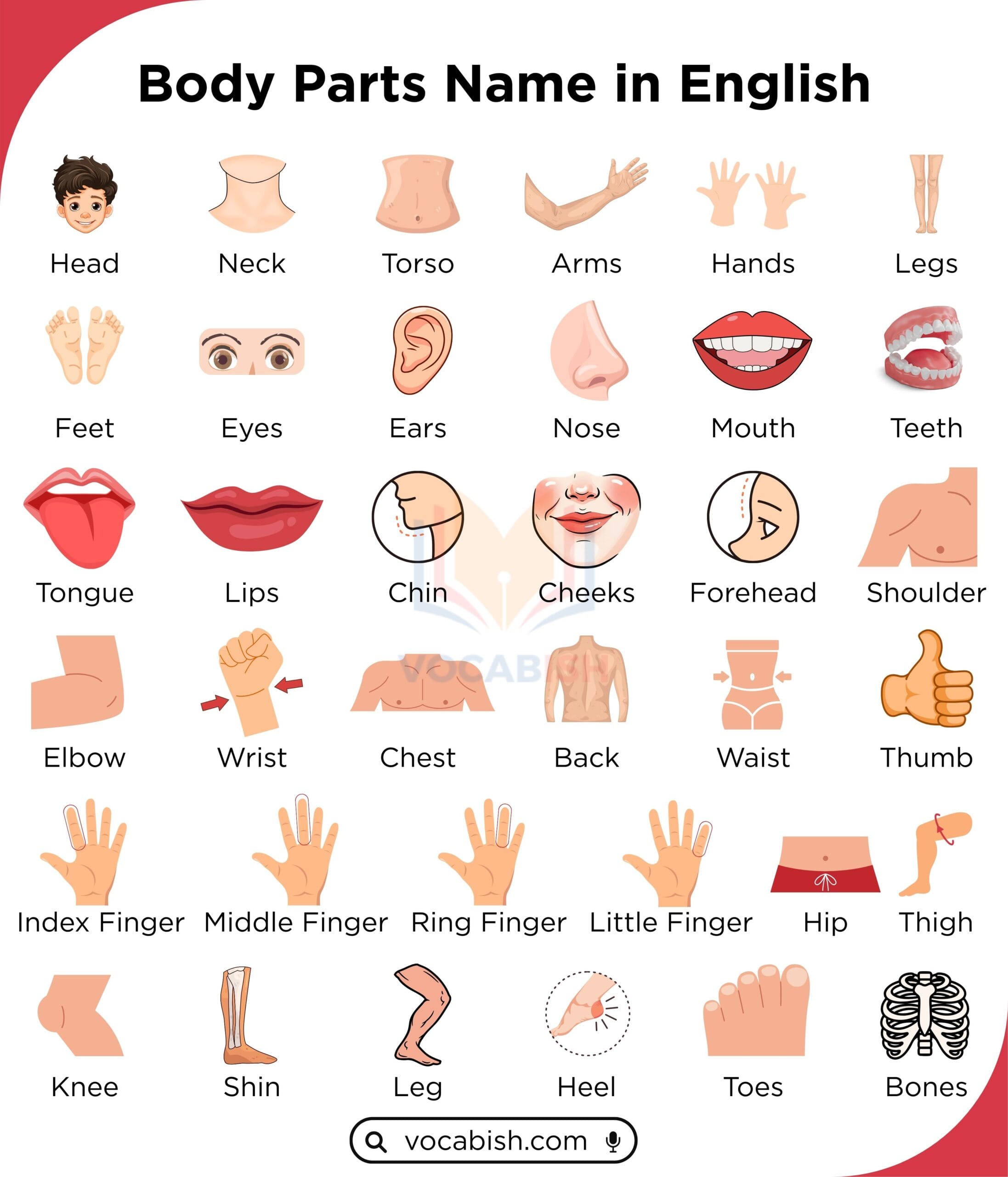 The human body is made of many different parts that help us move, think, feel, see, hear, and live. Each part has a special job. In English, we use these words in daily talk, school, health, and work life.