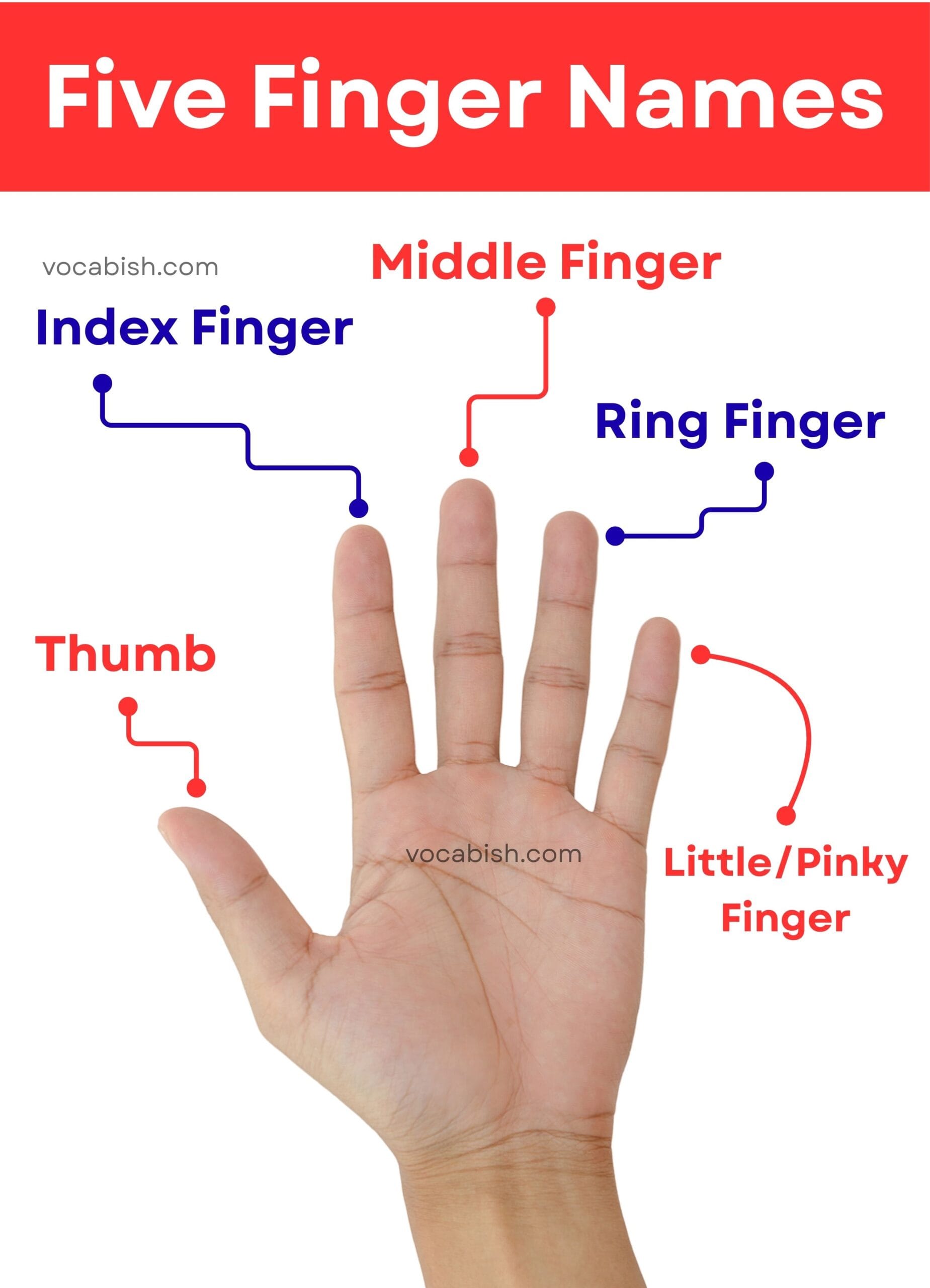 The five fingers are called thumb, index finger, middle finger, ring finger, and little finger.