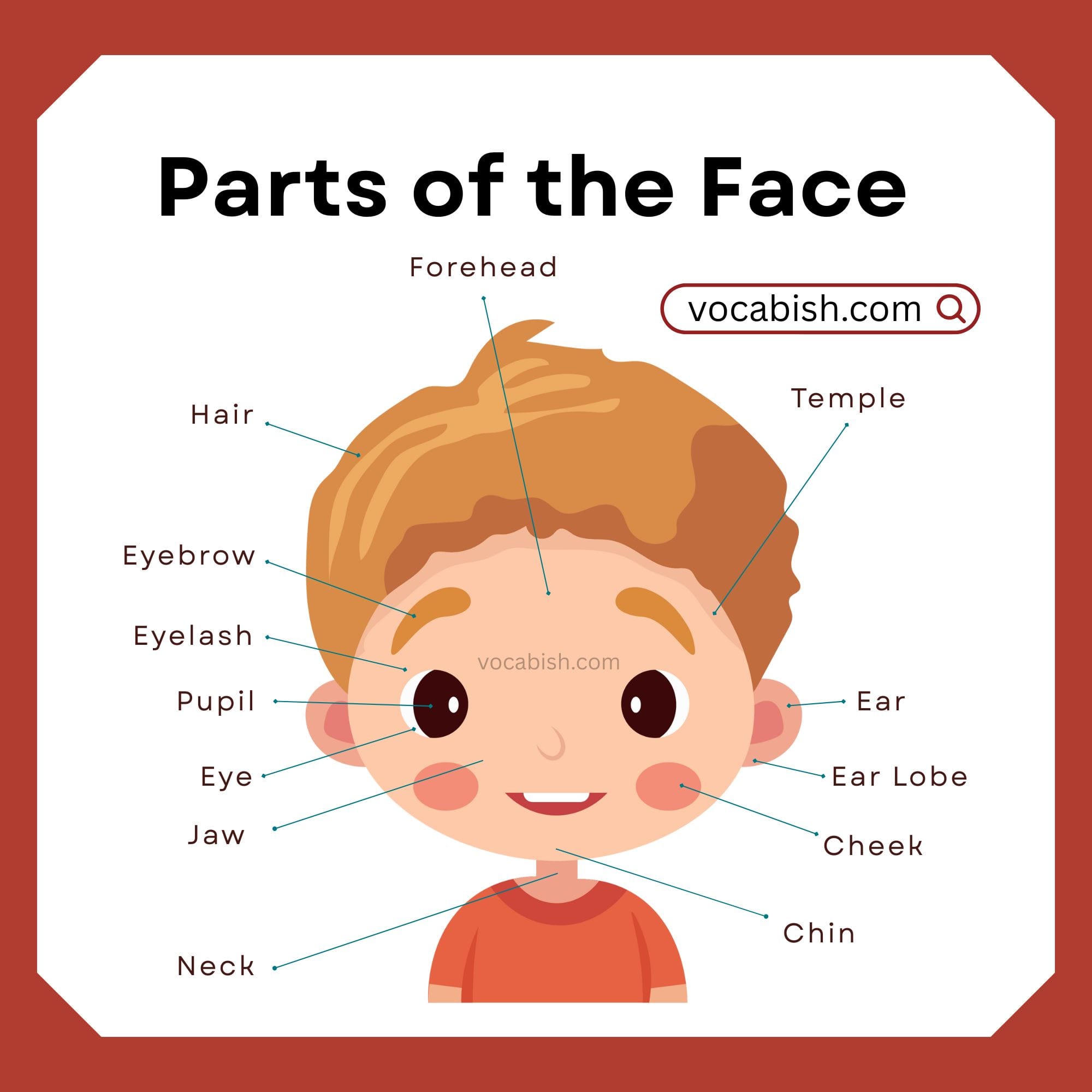 Common face parts include eyes, ears, nose, mouth, teeth, tongue, lips, cheeks, chin, and forehead.