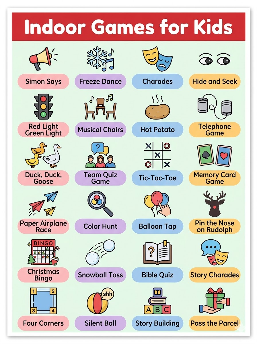 Indoor games for kids support thinking skills, cooperation, and communication. They also introduce common English words related to rules, turns, and game actions used in everyday conversations.