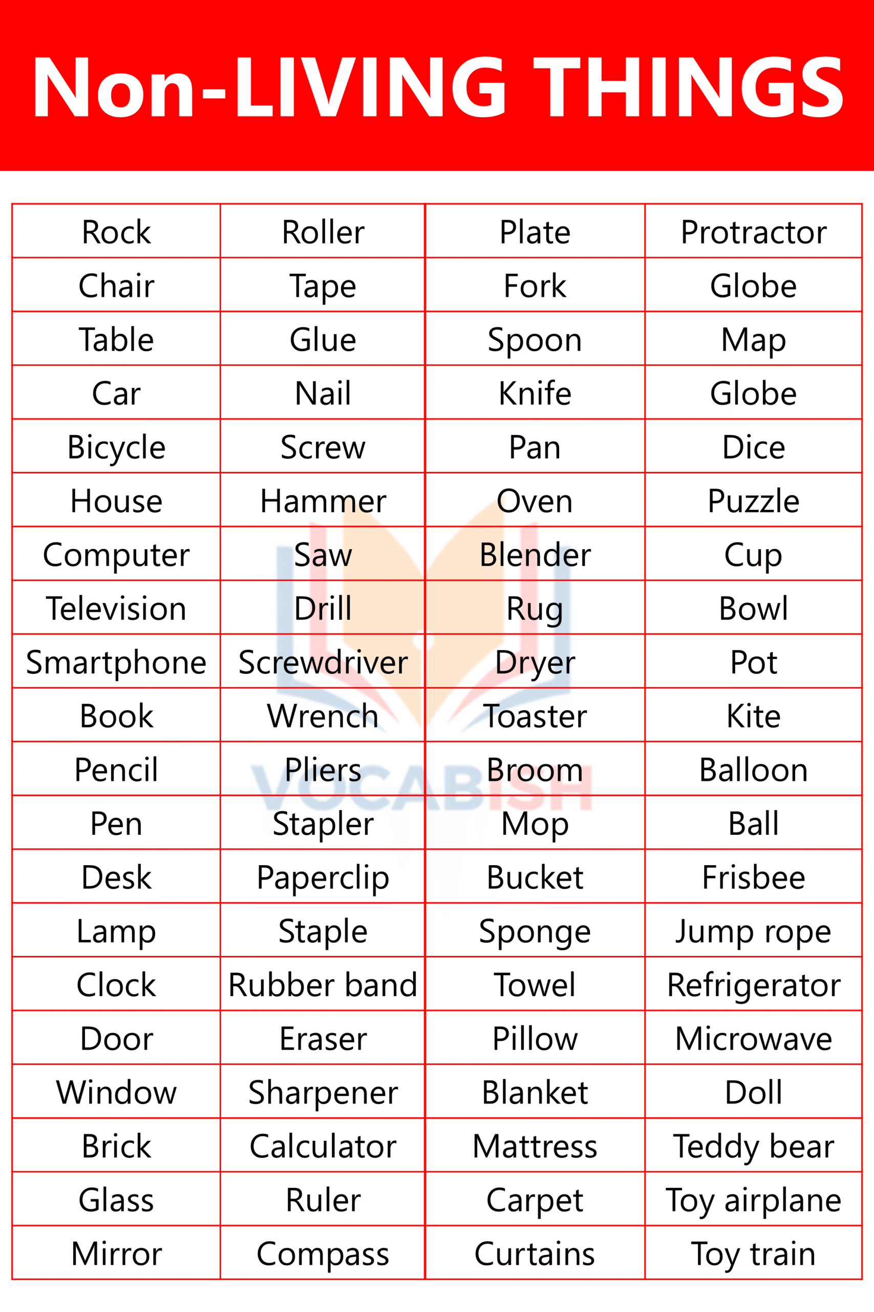 Non-living things do not grow, breathe, or need food. They do not move on their own and have no life in them.
