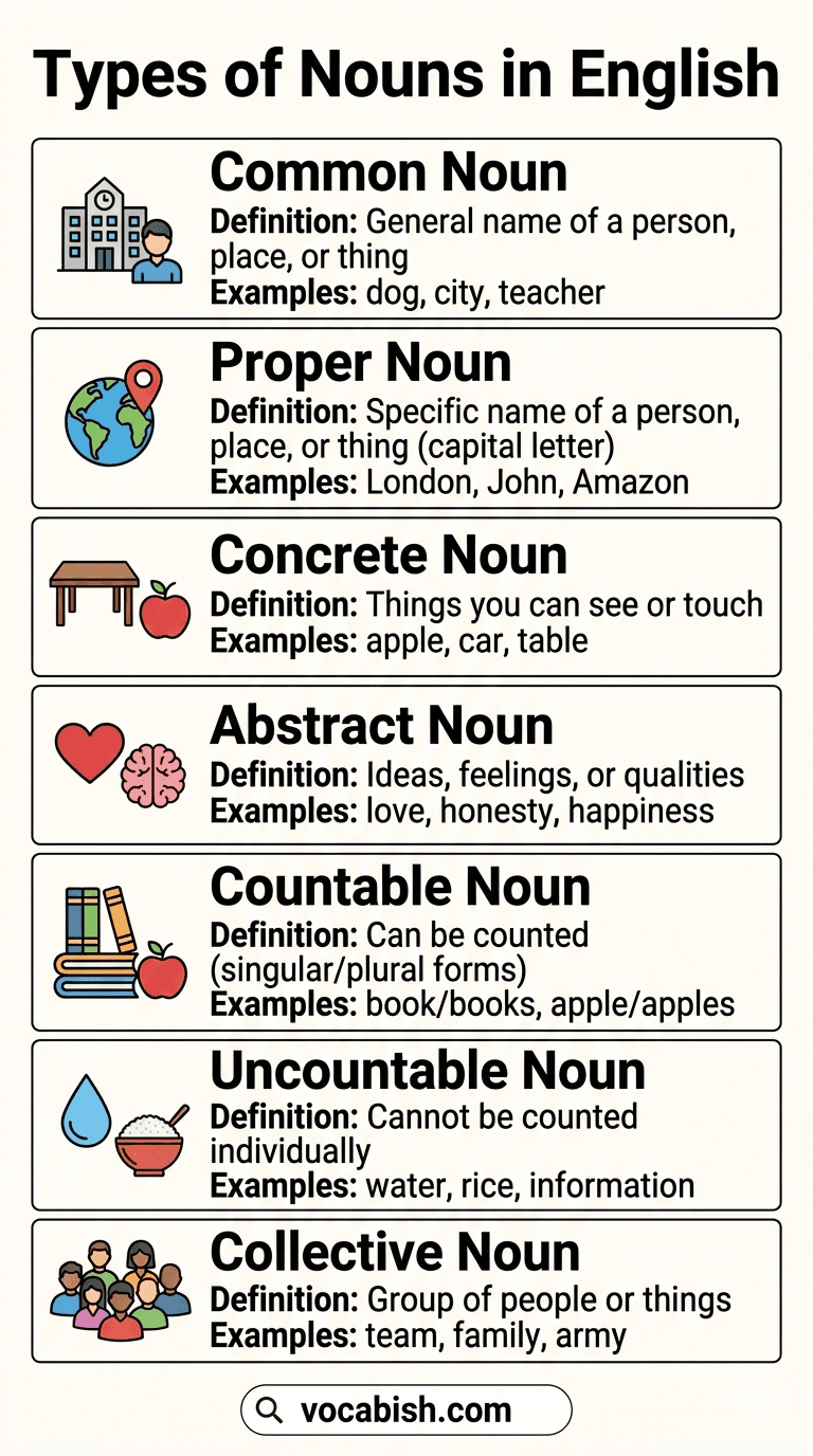 English nouns are divided into several types. Understanding these types helps you use articles, plurals, and verbs correctly.