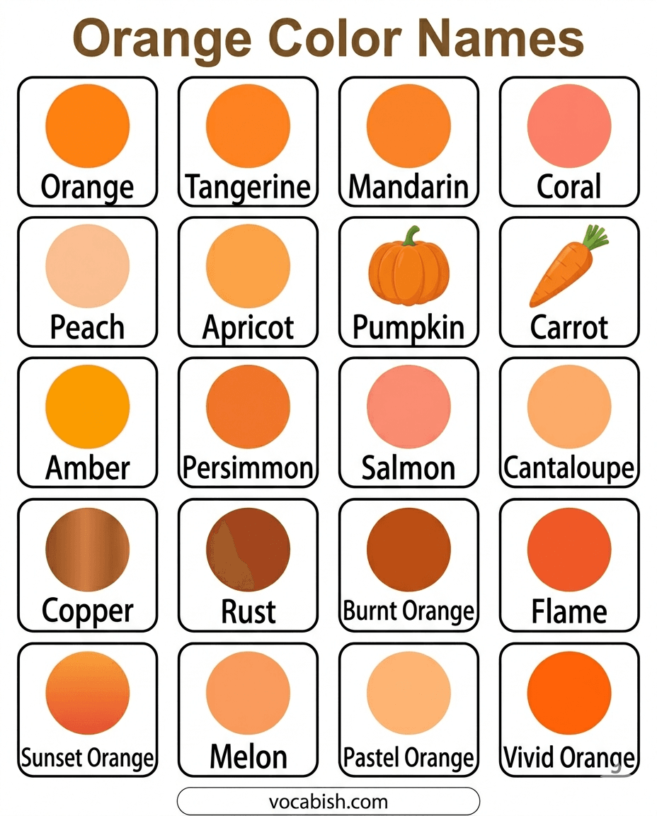Orange color names are vocabulary words used to describe different shades of the color orange. Some shades look bright and strong, while others appear soft and light.