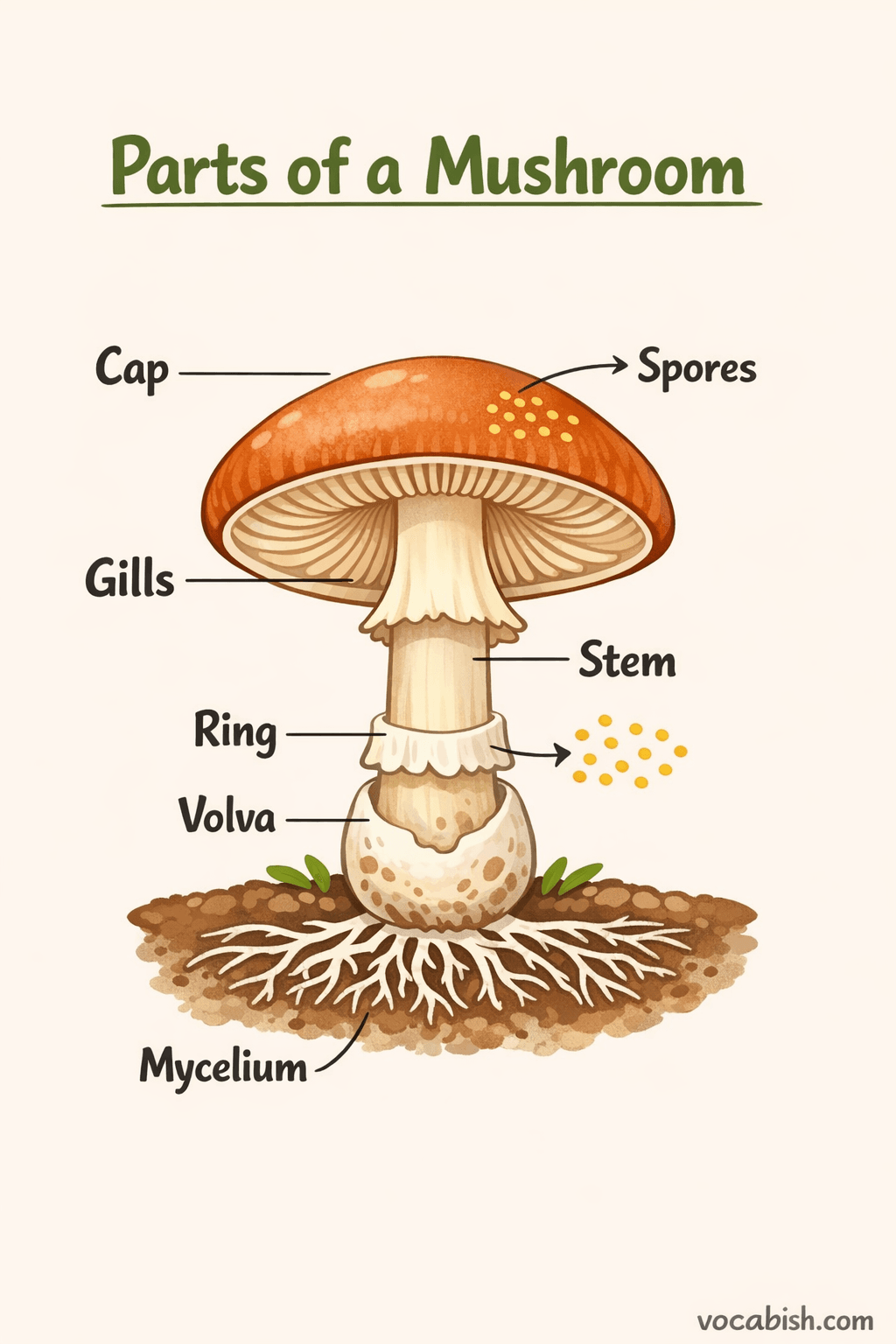 The parts of a mushroom include the cap, gills, stem, ring, volva, mycelium, and spores. Each part has a clear role in protection, support, or growth. Learning these words builds strong vocabulary and helps learners understand nature in simple English.