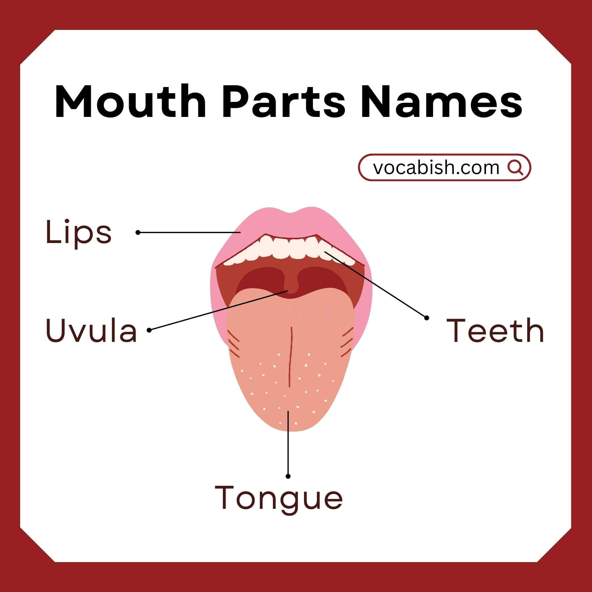 - Lips: Soft outer part of the mouth