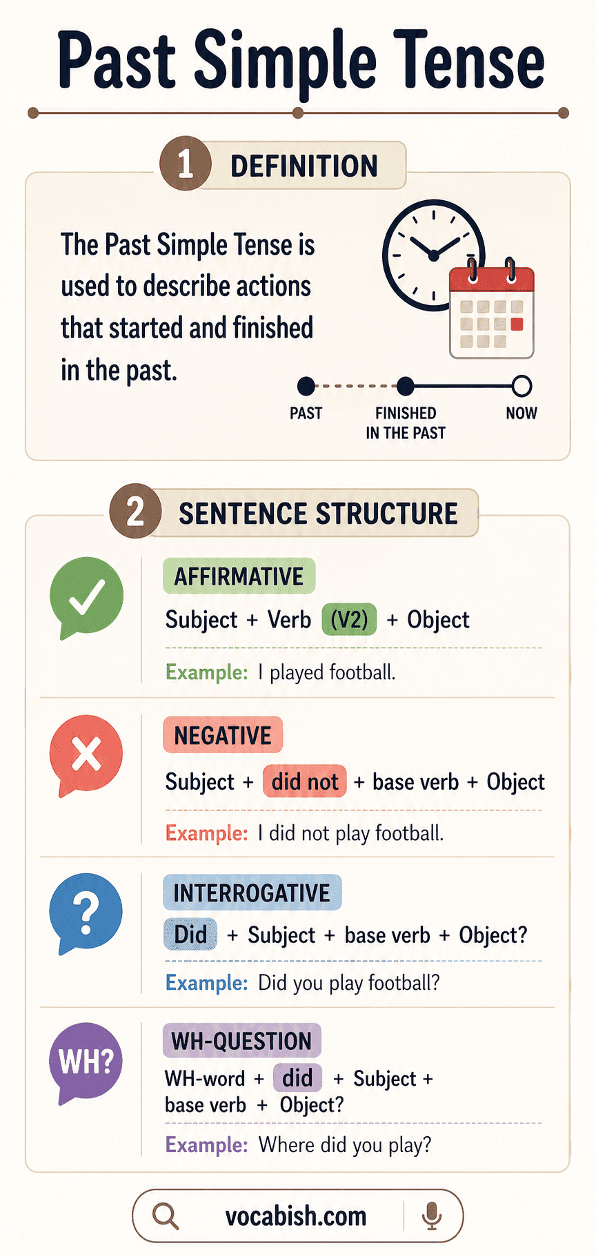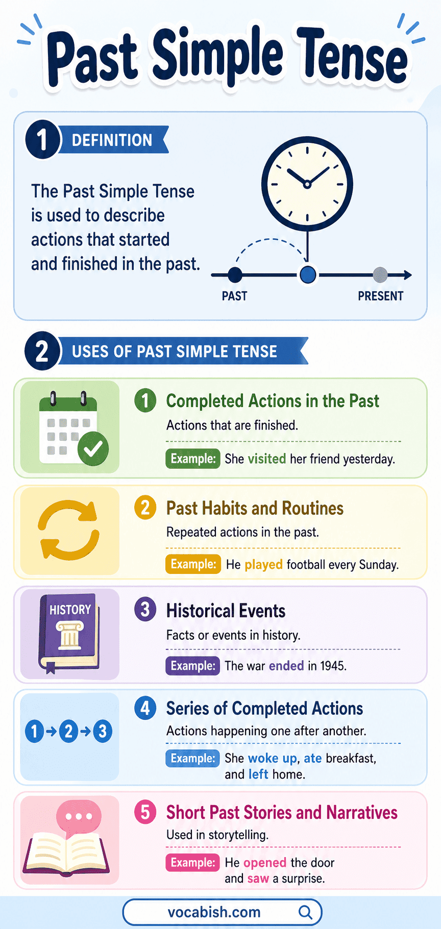 Past Simple Tense describes actions that started and finished in the past. You use it for completed events, past habits, and specific times like yesterday, last week, or in 2020.