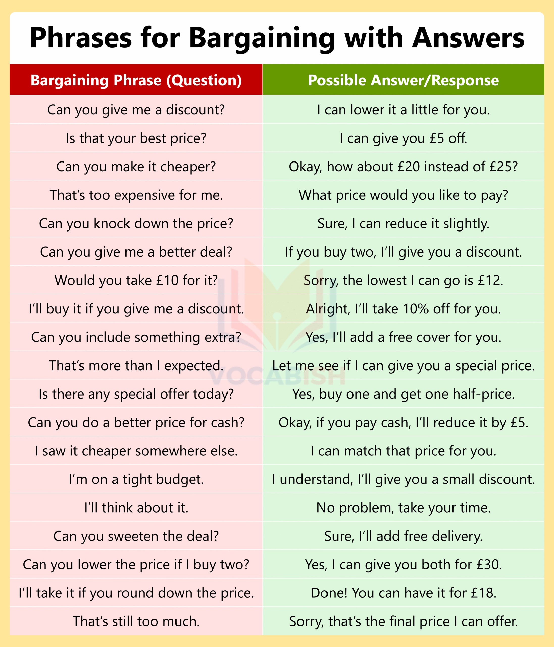 You can say, “Can you give me a better price?”, “Is there any discount on this item?”, or “Can you lower the price a little?” Using polite words makes bargaining easier and more friendly.