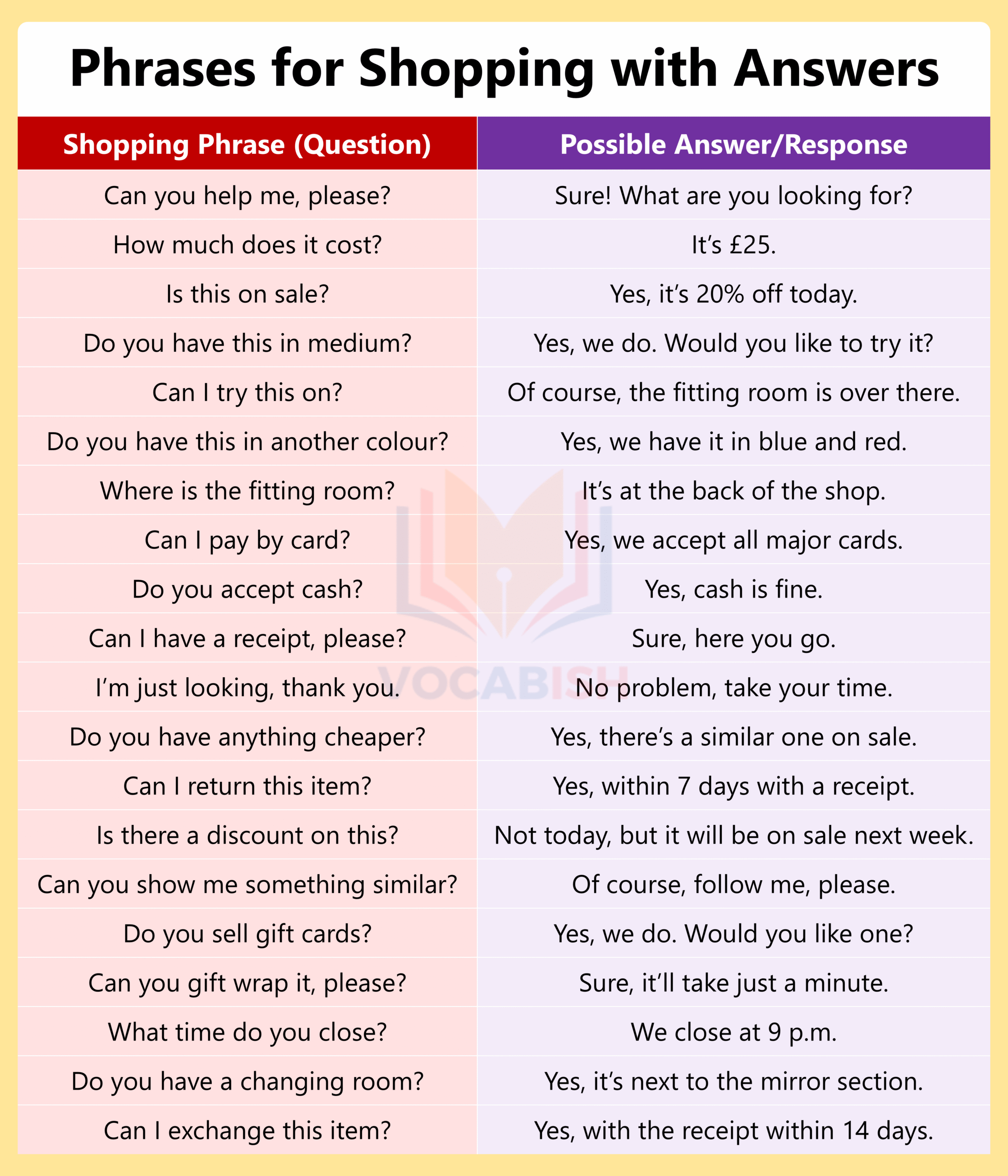 | Shopping Phrase (Question) | Possible Answer/Response |