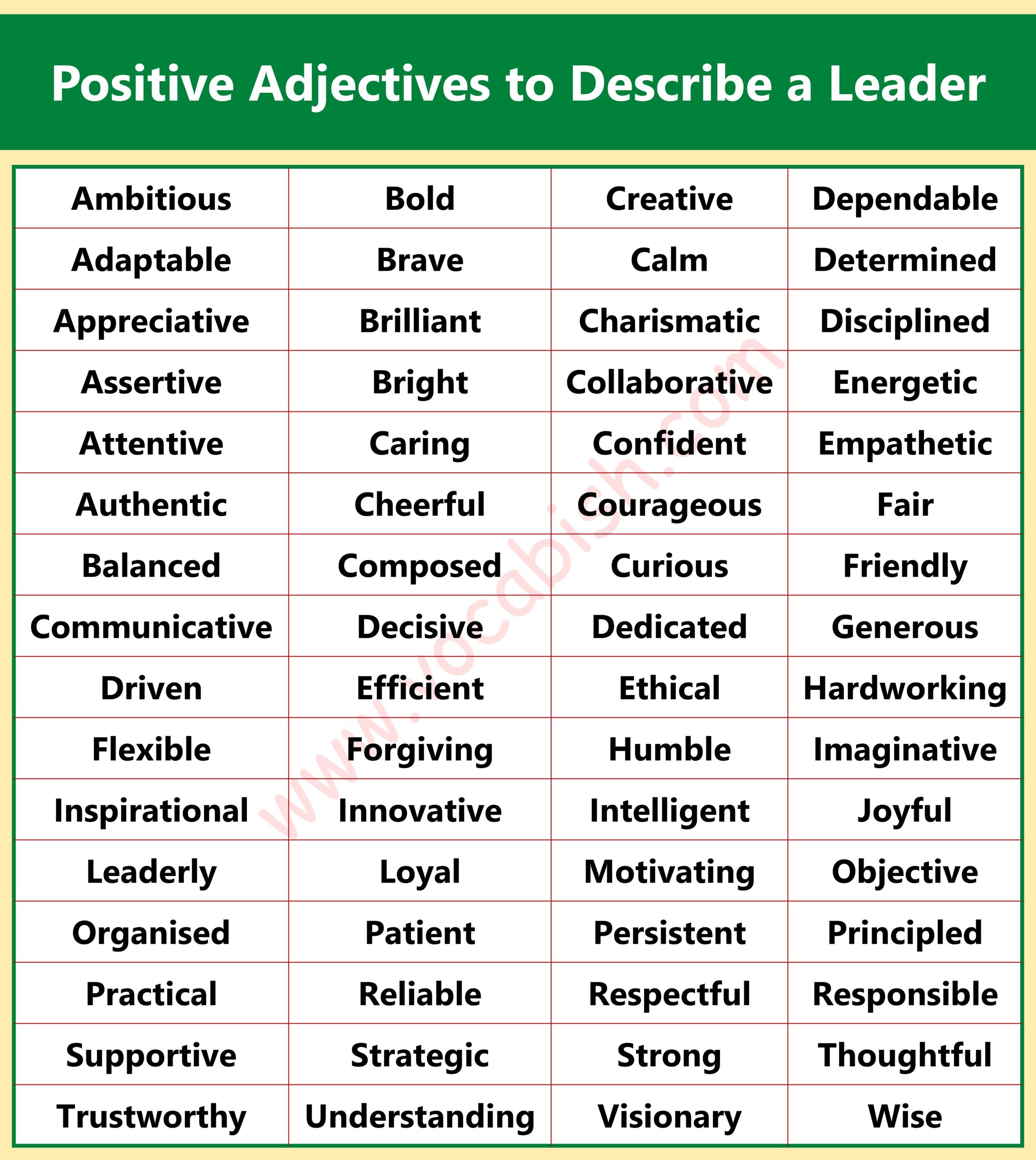 Positive adjectives are words that show good qualities. When describing a leader, they highlight strengths, abilities, and character. For example, words like honest, brave, and inspiring make someone sound trustworthy and strong.