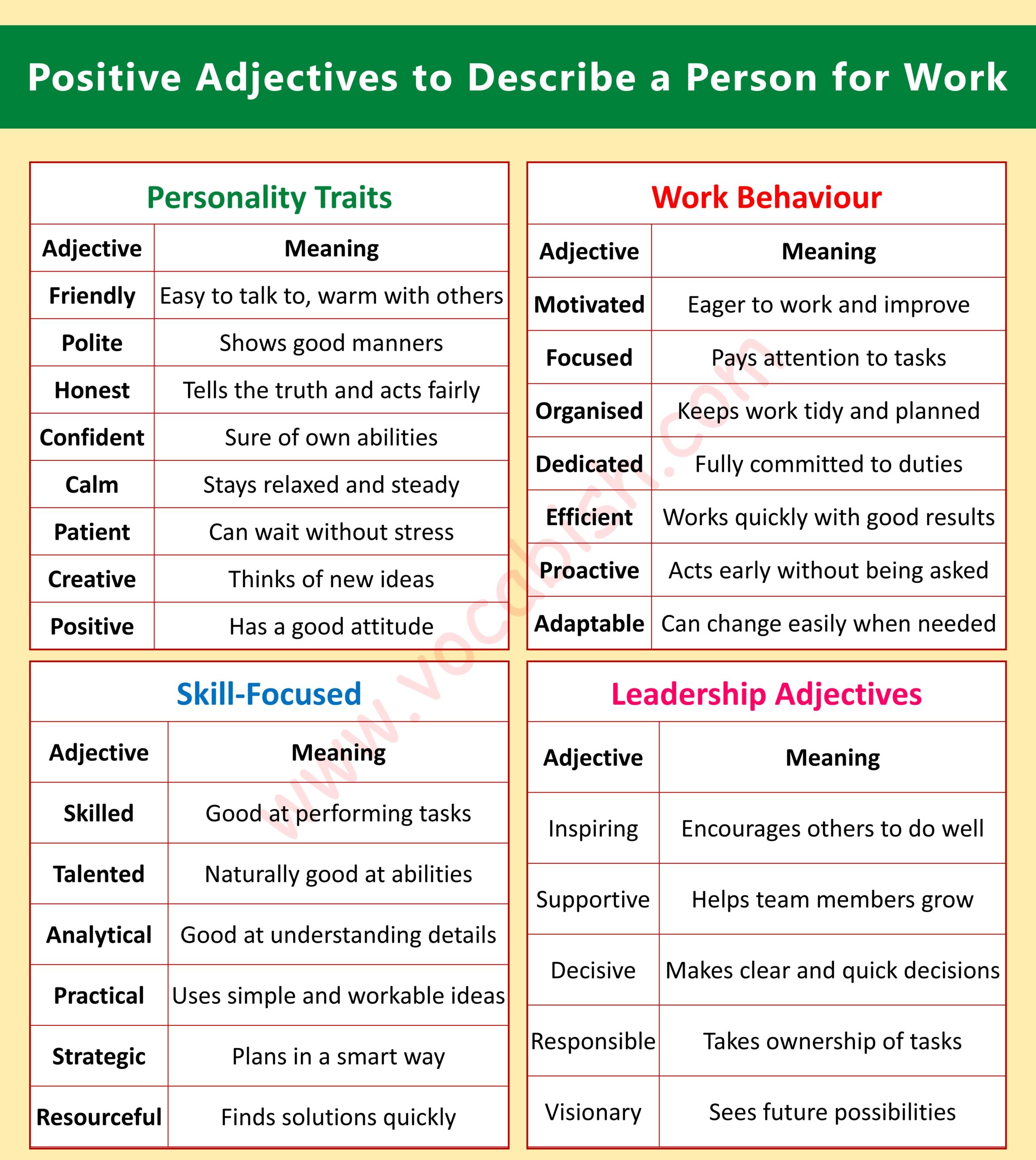 Positive adjectives help you describe people at work in a clear and confident way. They make your communication stronger and more professional. By using these simple and useful words, you can improve your English for job interviews, teamwork, and daily workplace conversations.