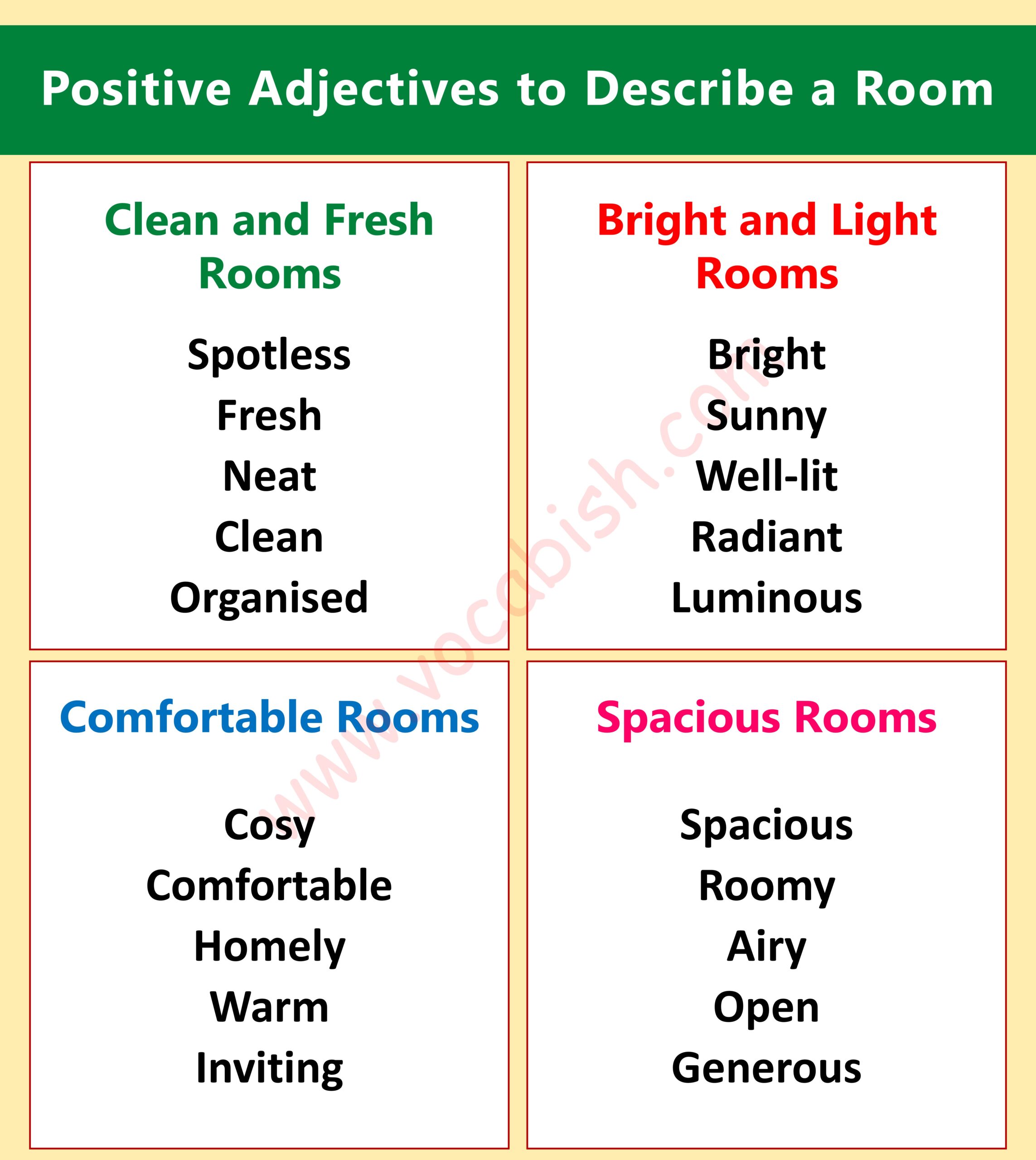 Positive adjectives for a room are words that show a room is pleasant, clean, comfortable, or inviting. These words help you explain what a room looks like, feels like, and how people may enjoy being inside it.