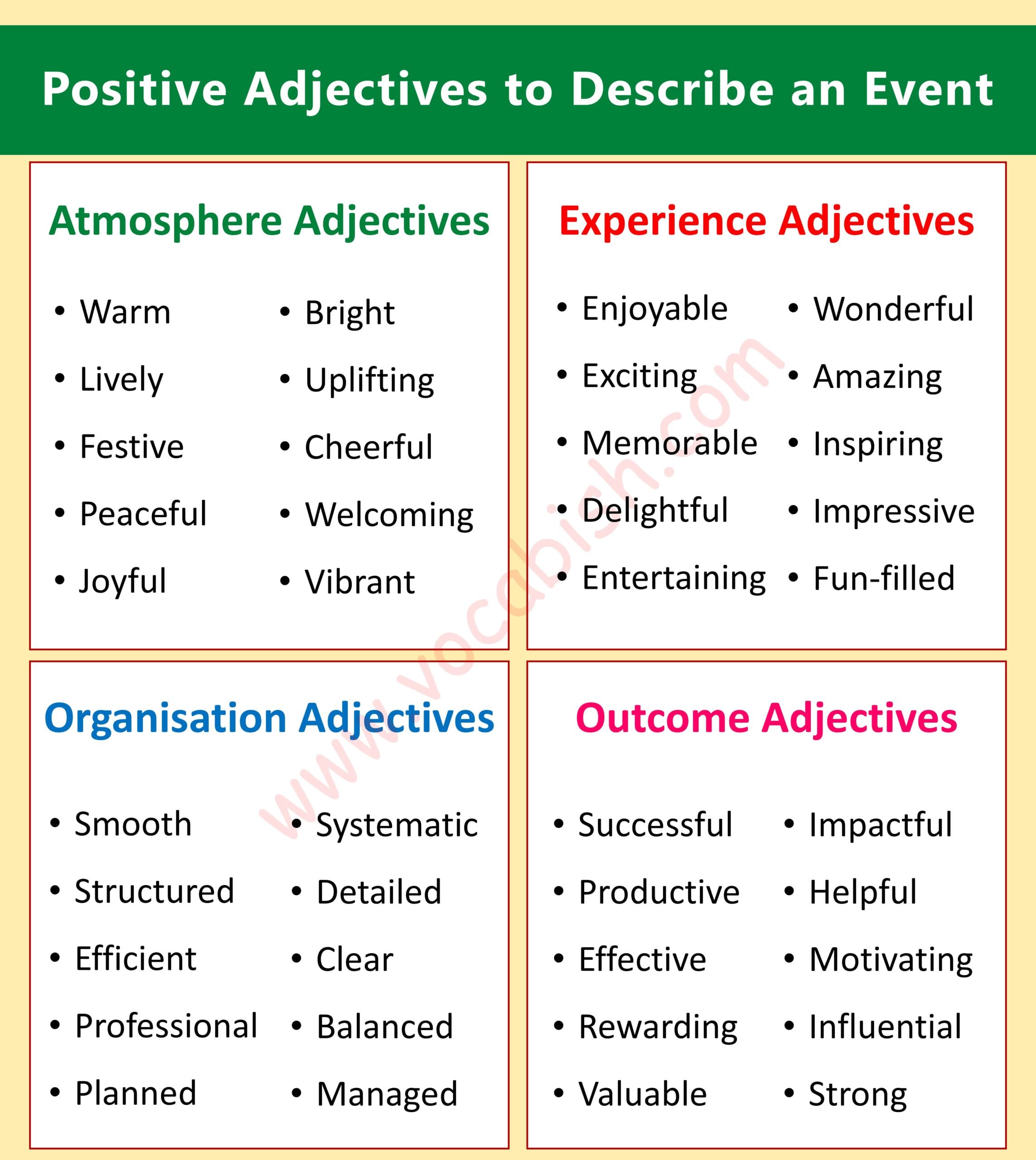 Positive adjectives for events are descriptive words that show an event was good, enjoyable, or successful. These adjectives help you explain the atmosphere, the experience, the organisation, or the results of the event.