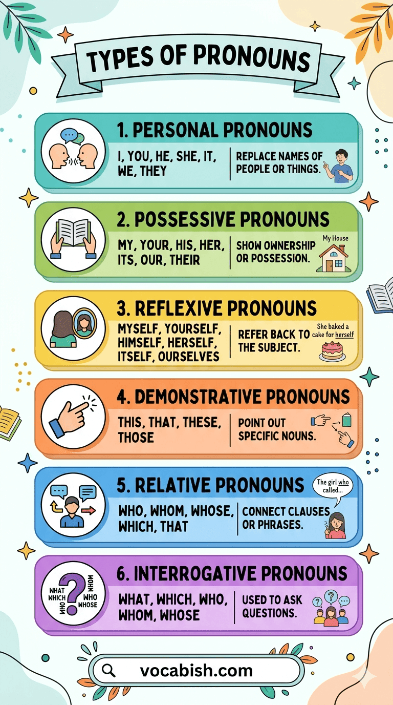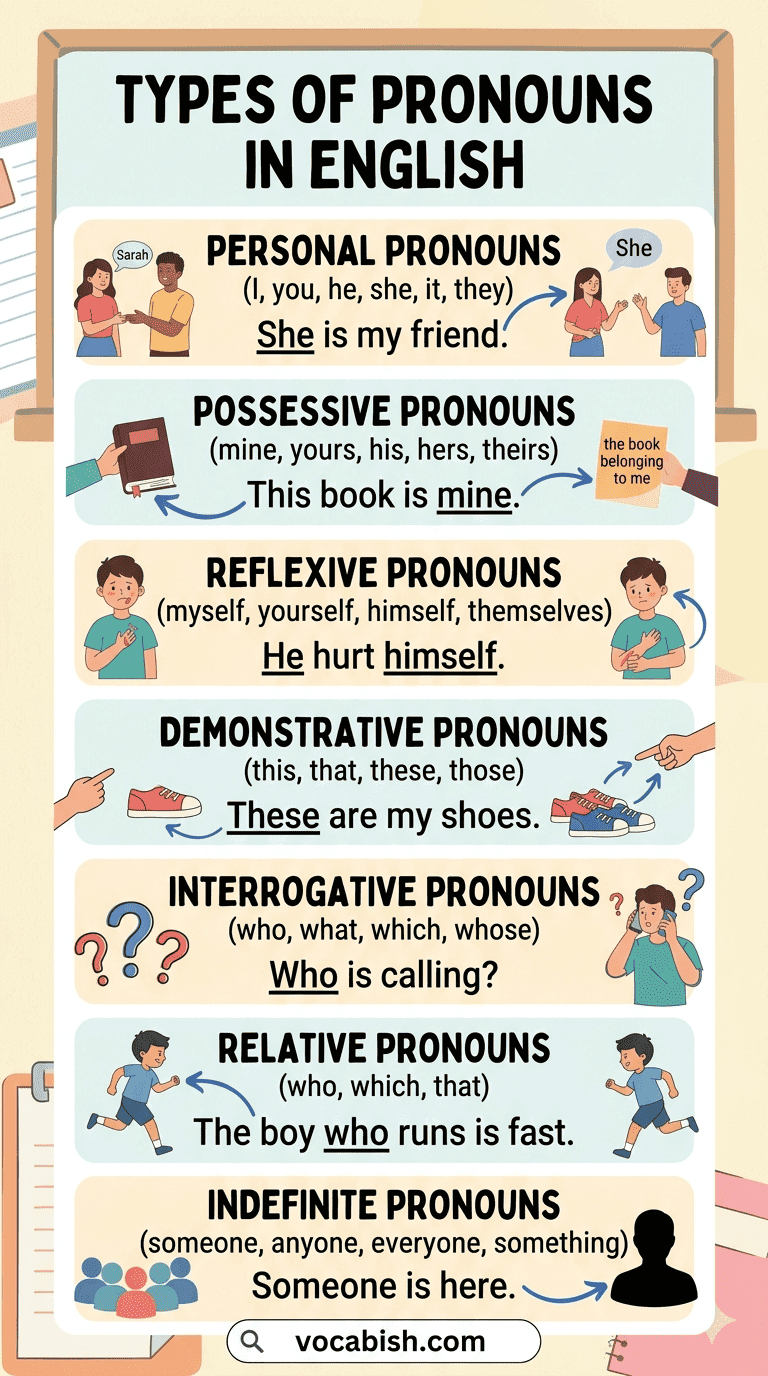 Pronouns are small words, but they do a big job. Once you understand how each type works—especially personal, possessive, and relative pronouns—you’ll notice your English becoming smoother and more natural. Keep practicing with real sentences, and pay attention to how native speakers use them. That’s where everything starts to click.