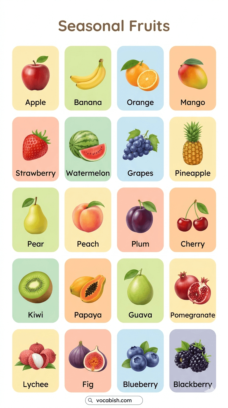 Learning vocabulary related to food helps build strong everyday English skills, and one useful topic is Seasonal Fruits Names in English with Their Pictures. These are words that describe fruits available at different times of the year, such as mango in summer or orange in winter. Understanding these names helps learners talk about shopping, health, and daily meals with more confidence.