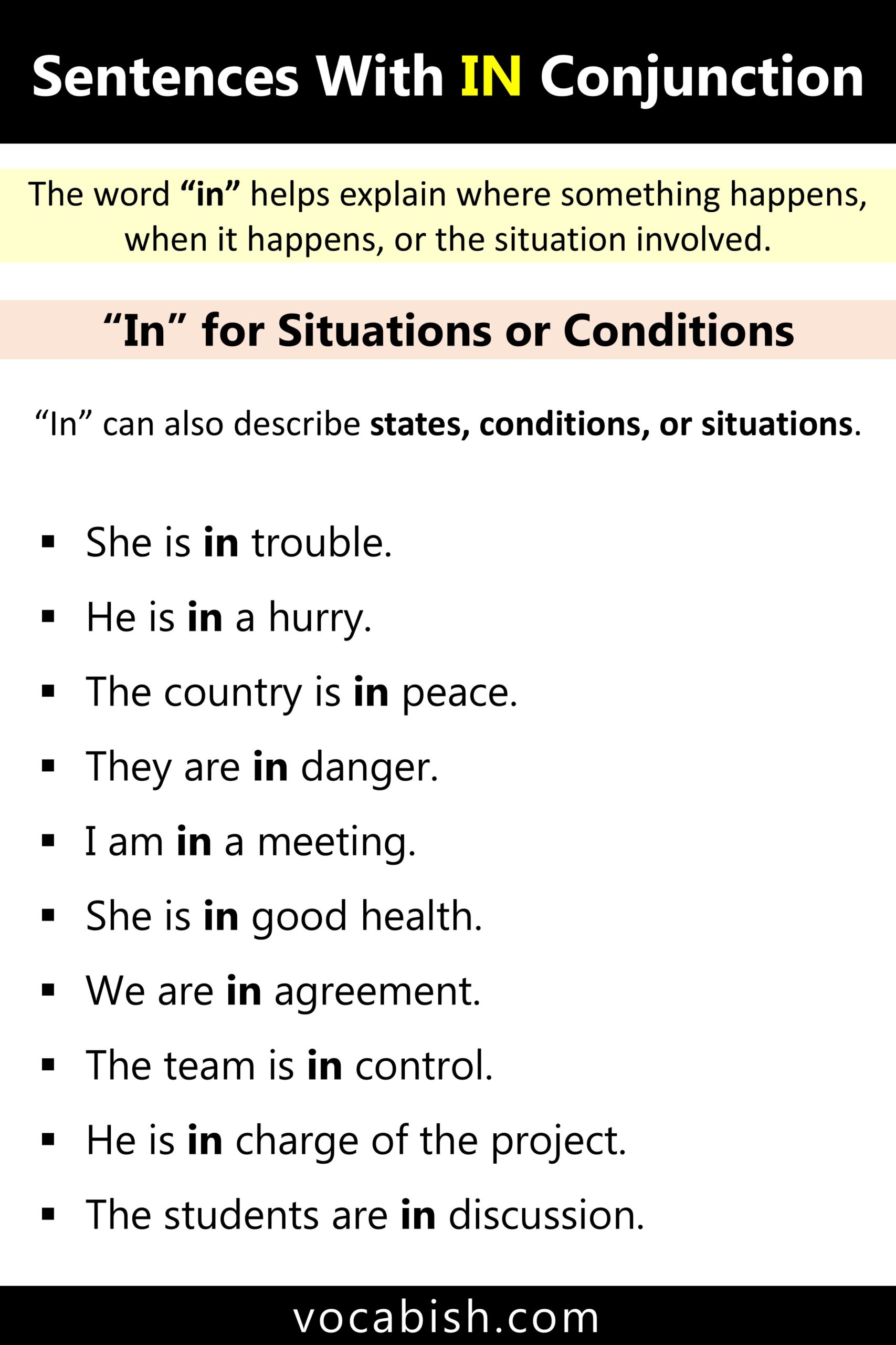 “In” is mainly a preposition, not a conjunction. However, learners often search for “sentences with in conjunction” when they want examples of sentences where “in” connects ideas.