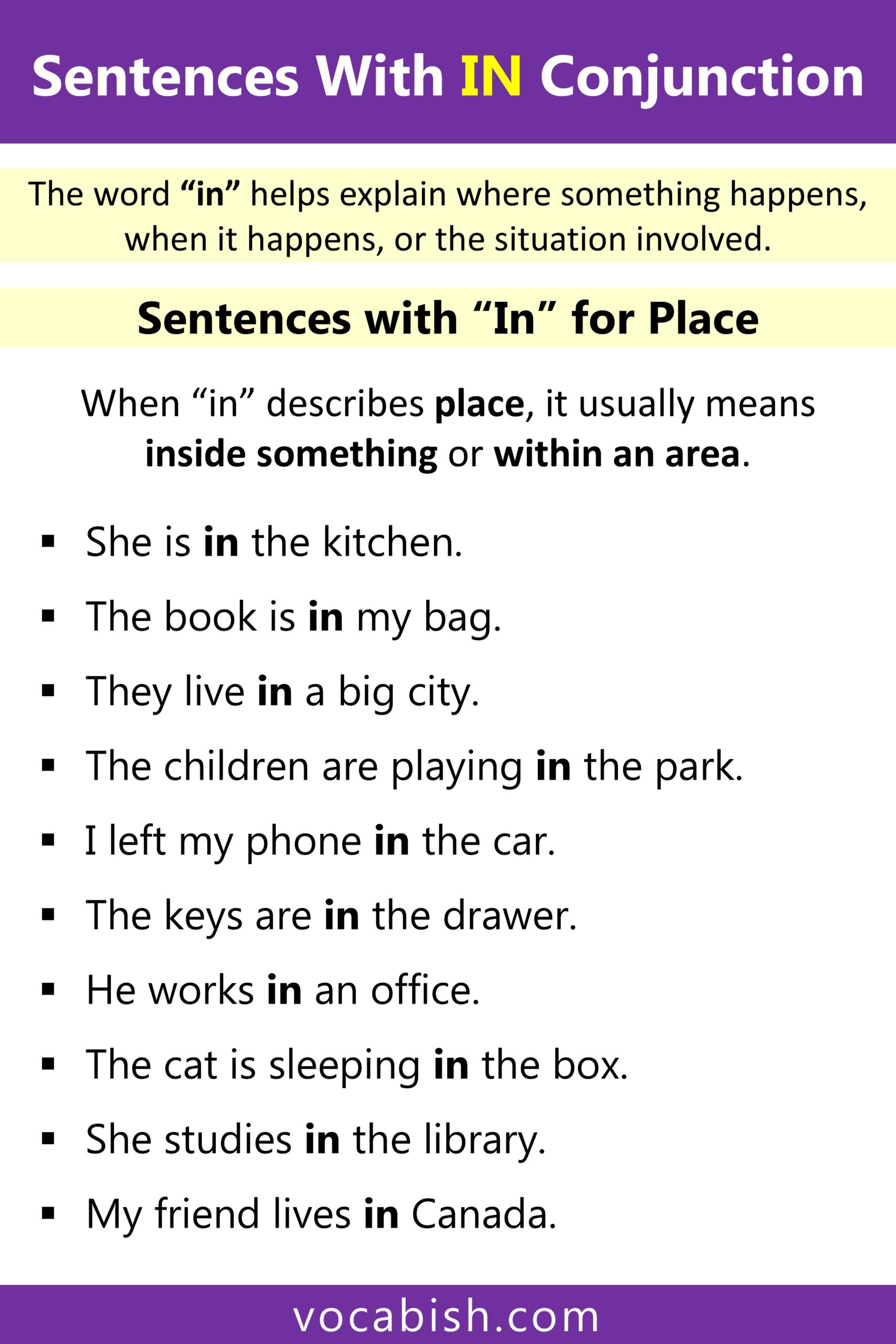 Sentences with “in” conjunction usually show how the word “in” connects ideas related to place, time, or situation. In most cases, “in” works as a preposition inside a sentence structure.