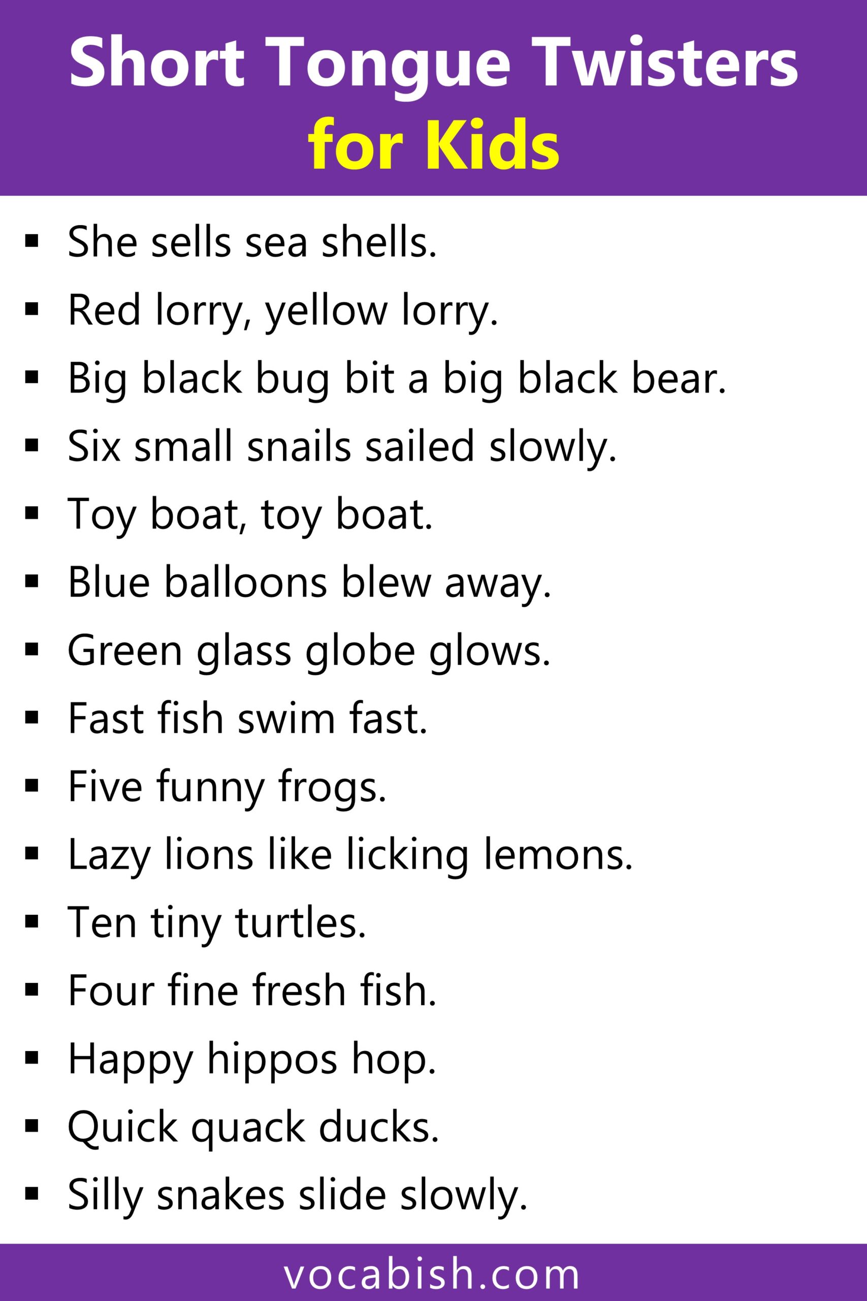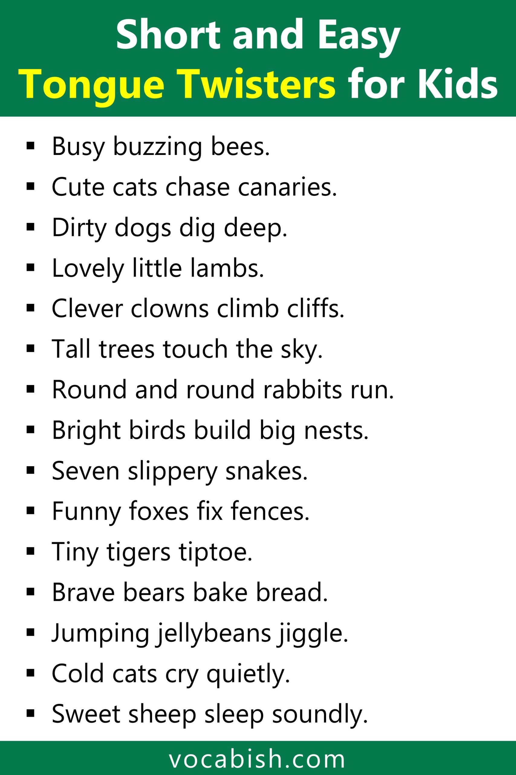 Short tongue twisters for kids in English are simple, playful sentences with repeated sounds. They help children practice pronunciation, improve speaking clarity, and learn new words in a fun way.