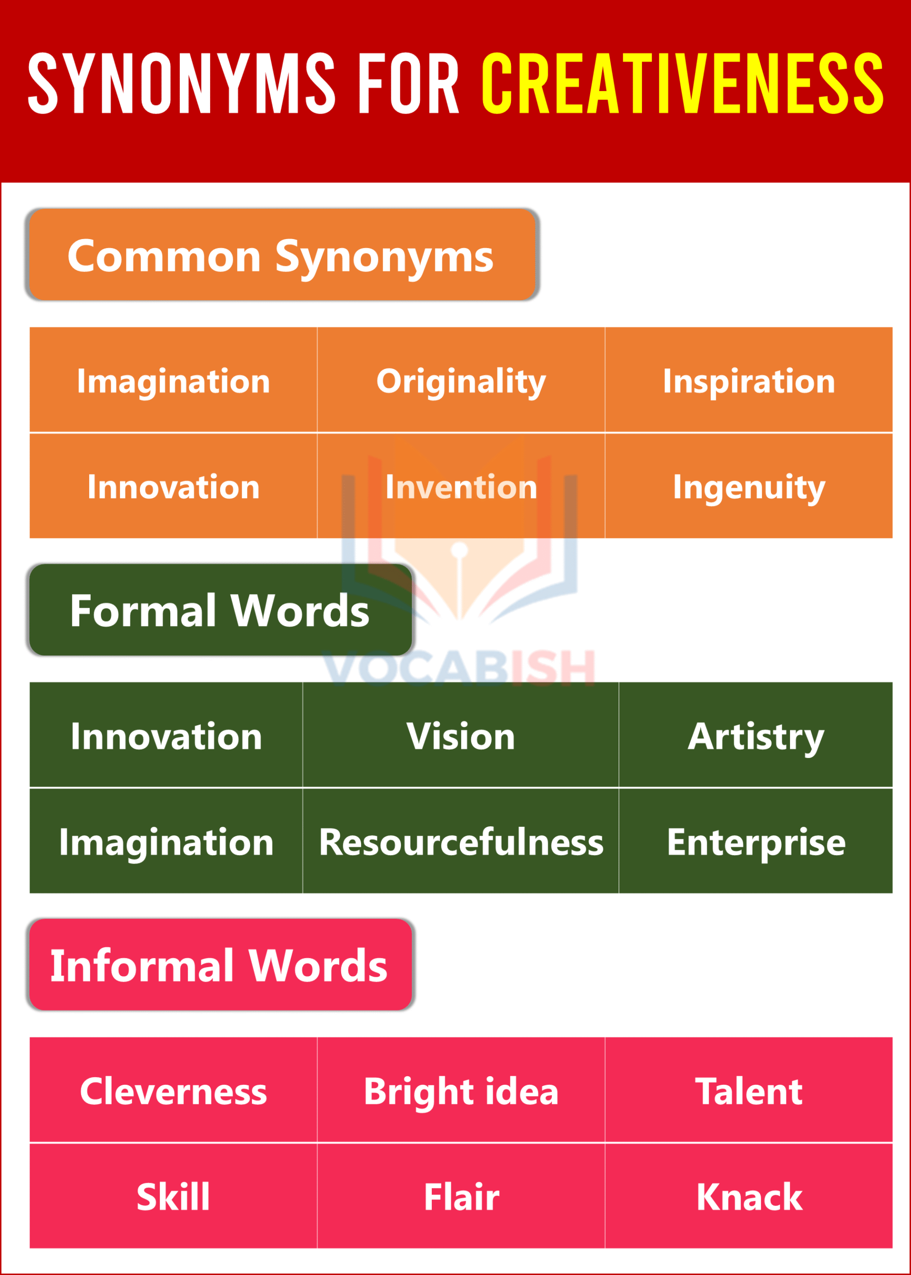 - Its synonyms like imagination, innovation, and originality are often used in everyday English.