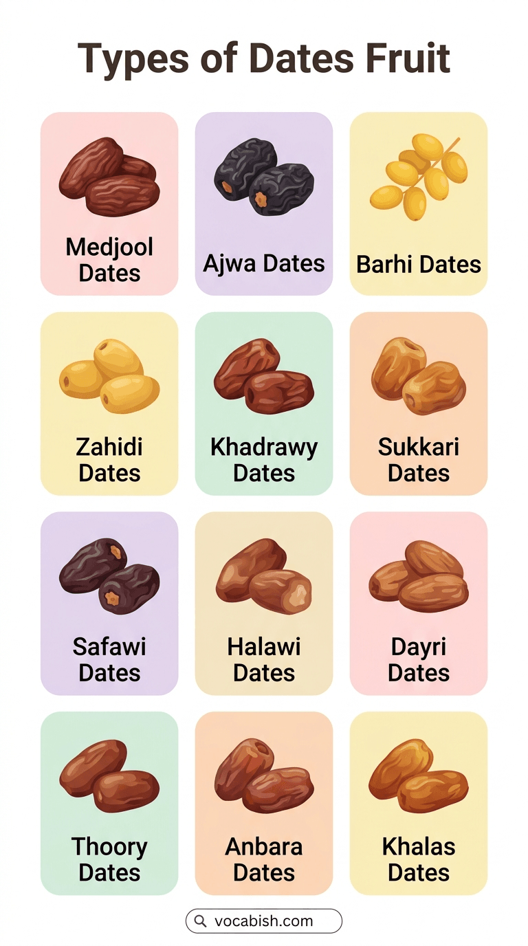Dates fruits are a group of natural foods that come in many varieties such as Medjool, Ajwa, Deglet Noor, Barhi, and others. Each type has a different shape, taste, and texture, which makes this vocabulary useful for everyday communication about food, health, and shopping. Learning the names of these fruits helps English learners understand food-related words used in markets, recipes, and daily conversations. It also supports better reading when labels and product names appear in stores or online.