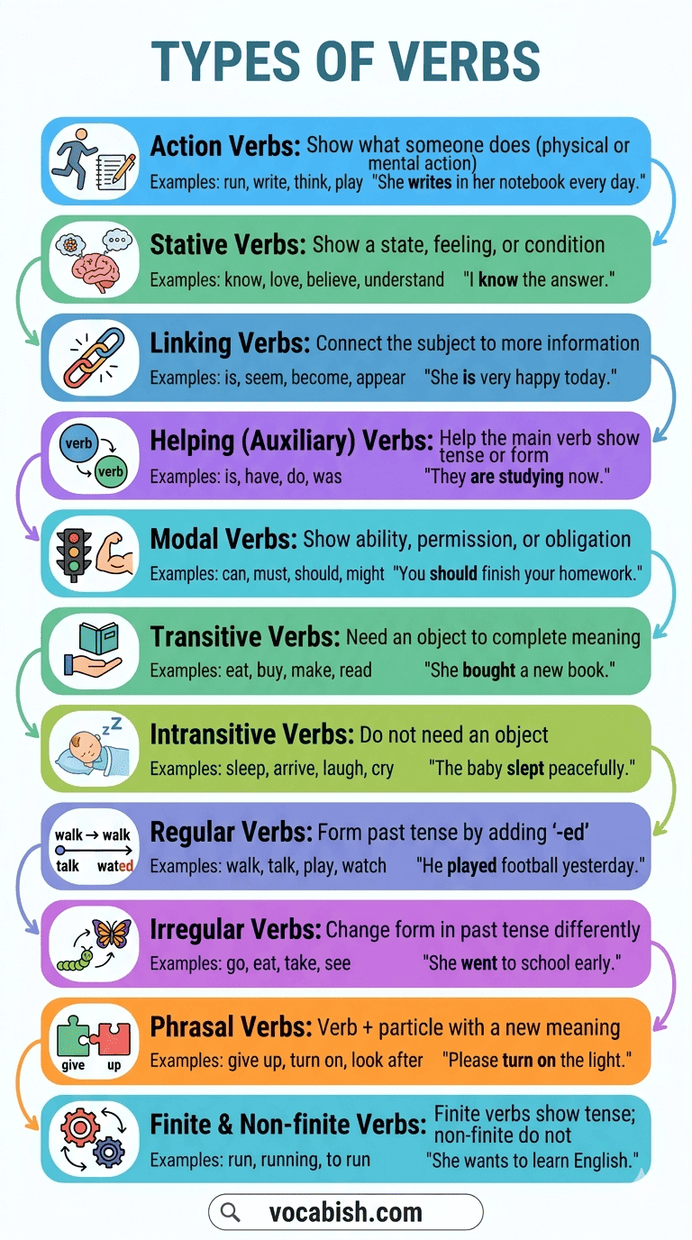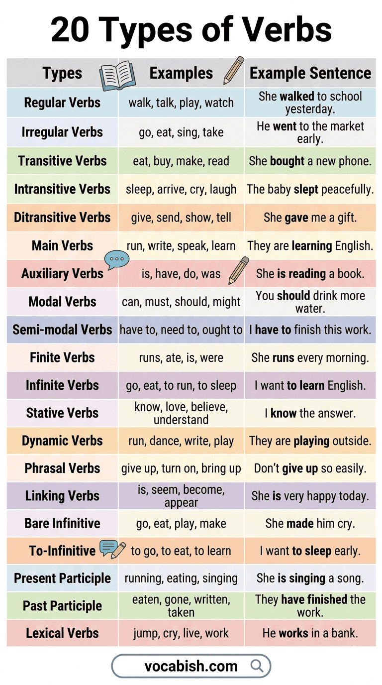 English verbs can be grouped into several types based on their function. Let’s break them down clearly.