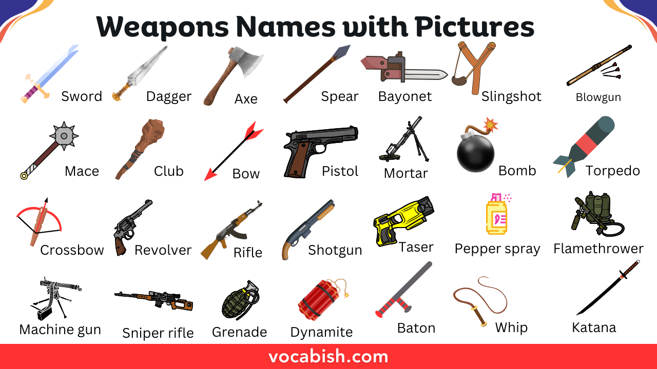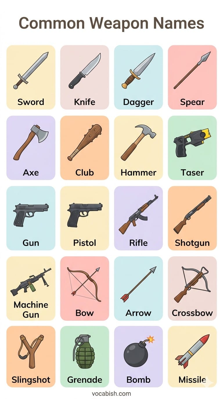 Weapons come in many types, from simple knives to powerful guns. Understanding their names in English helps learners expand their vocabulary. Whether for history, gaming, or general knowledge, knowing these words is useful.