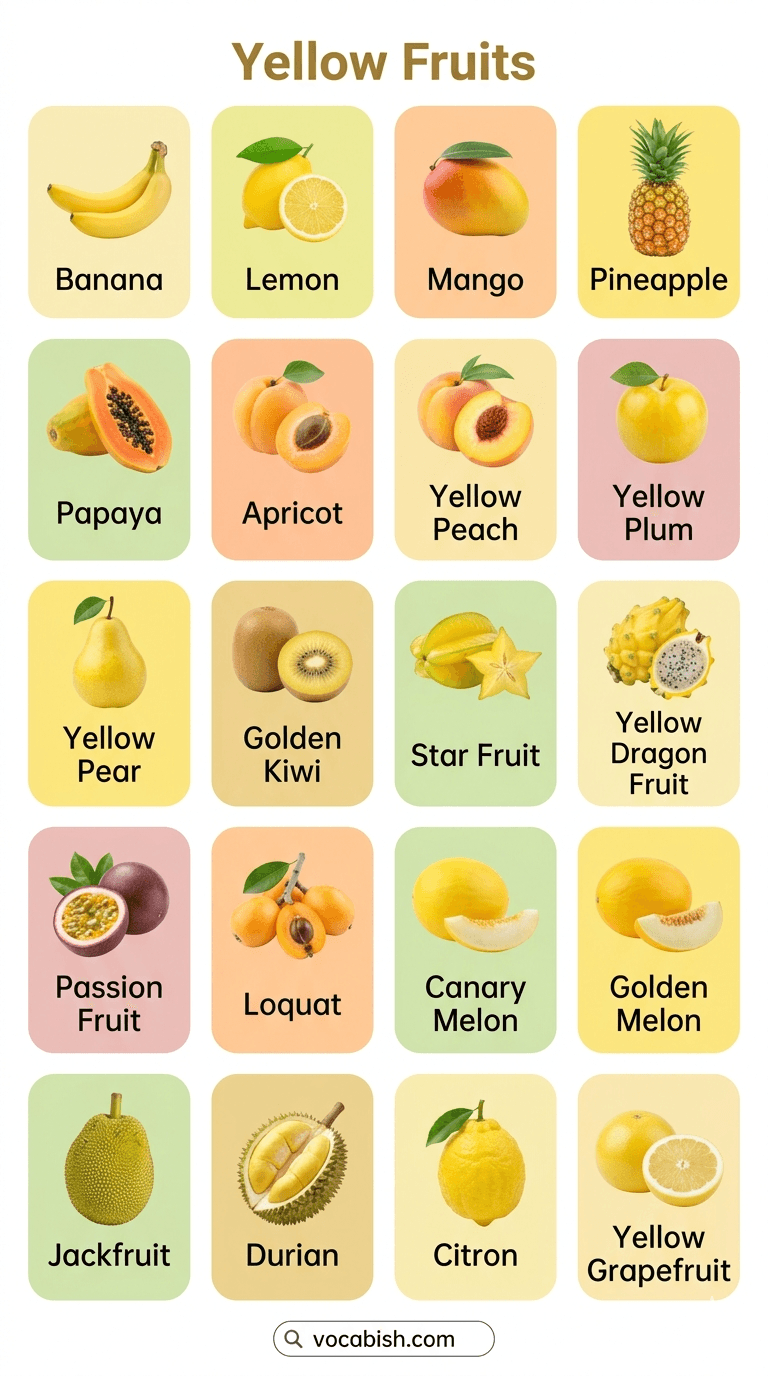 Yellow fruits are colorful, nutritious, and widely enjoyed around the world. Popular fruits such as banana, mango, lemon, pineapple, papaya, and apricot are easy to recognize and commonly used in everyday meals. Learning the list of yellow fruits name in English helps build vocabulary and also increases knowledge about healthy foods found in nature. From tropical varieties to citrus fruits and small berries, yellow fruits offer a wide range of flavors, textures, and uses in cooking and nutrition.